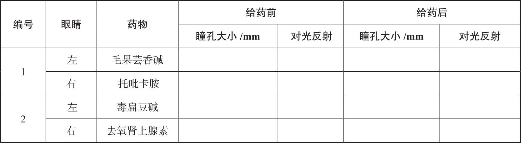 表1-5-1-2 传出神经系统药物对瞳孔作用实验结果