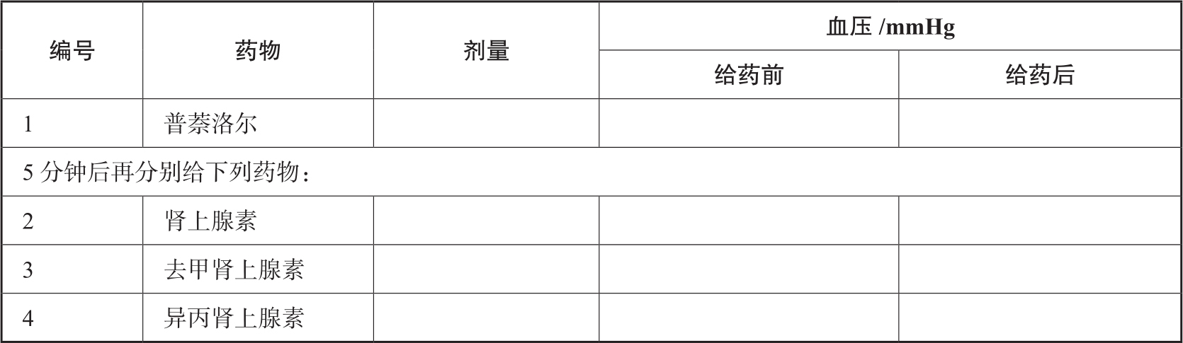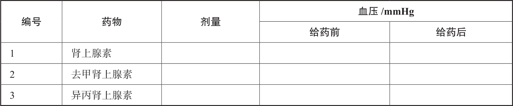 第一组:观察拟肾上腺素药对血压的影响(表1-5-2-1)。