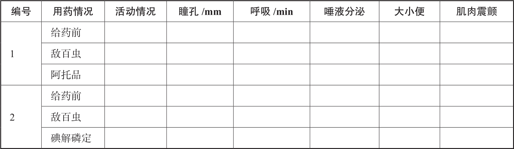 1.取家兔2只,称重、标记、编号。观察、测量并记录下列指标:活动情况、呼吸频率、瞳孔直径、唾液分泌、大小便及粪便形态、肌肉震颤及肌张力。