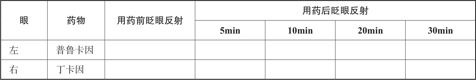 取家兔1只,用兔固定器固定。剪去睫毛,用兔须触及角膜,测试其眨眼反射。然后将家兔下眼睑拉成杯状,左右两侧分别滴入1%普鲁卡因溶液与1%丁卡因溶液各3~4滴,并用手指压住内眦部位,防止药液经鼻泪管流入鼻腔吸收。滴药后,将下眼睑与上眼睑合拢,使药液在结膜囊内停留约1分钟,与角膜充分接触,然后放开任其自溢。滴药后按下表定时测试两眼眨眼反射之有无或快慢,比较两眼有何差别。
