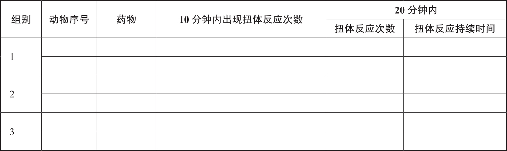 4.观察20分钟内扭体反应的次数,每次持续的时间,将各组实验结果记录于下表内。