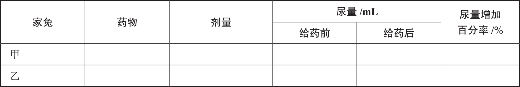 2.先将导尿管用液体石蜡润湿,自尿道口轻轻插入,当导尿管进入膀胱后,可见尿液滴出。将导尿管固定,轻压腹部使膀胱内积存的尿液全部排出。分别收集两只家兔用药前30分钟内的尿液。然后,甲兔经耳缘静脉注射生理盐水0.5mL/kg,乙兔经耳缘静脉注射呋塞米0.5mL/kg,收集用药后30分钟的尿液。