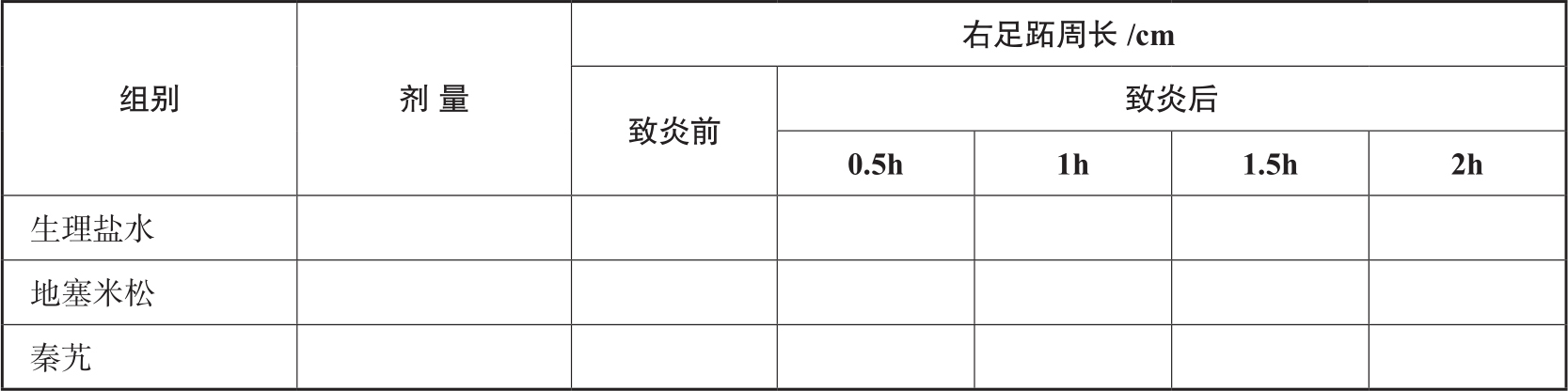 生理盐水、秦艽水煎醇沉液(1g/mL)、地塞米松注射液(5mg/mL)、10%蛋清溶液、苦味酸溶液。