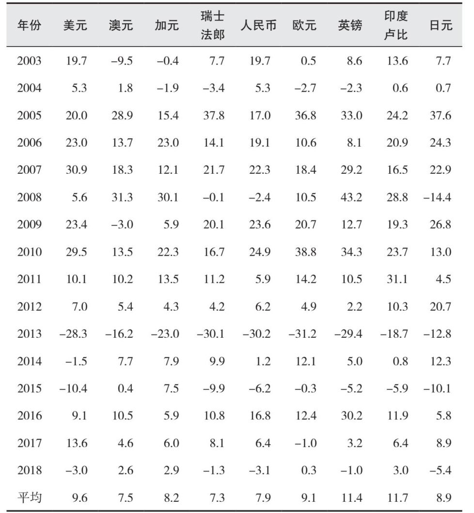 表2.1 2003—2018年黄金相对世界主要货币的表现(单位:%年度变化)