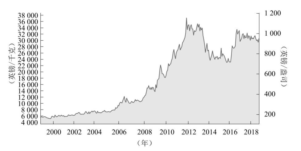 图2.1显示了20年间以英镑计的黄金价格变化。黄金的价格已经从每千克6 000英镑涨到每千克超过30 500英镑。