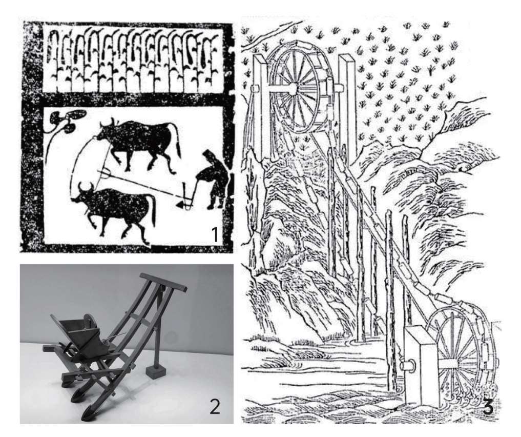从图7.2(1)可知,产生于春秋战国时期的铁犁牛耕是我国古代农业最主要的生产方式,铁犁牛耕的出现推动了生产力的发展和井田制的解体,推广铁犁牛耕使得唐朝的农业迅速发展。图7.2(2)是耧车,据东汉崔寔《政论》的记载,由三只耧脚组成的耧车,就是三脚耧。三脚耧下有三个开沟器,播种时,用一头牛拉着耧车,耧脚在平整的土地上开沟播种,同时进行覆盖和镇压,一举数得,省时省力。图7.2(3)是高转筒车,是古代中国的农用工具。高转筒车提水的高度比一般筒车高。这种筒车通常在水很低而岸很高的地方使用。