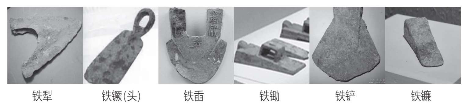 春秋战国时期是中国社会发生重大变革的时期,农业生产的发展也进入了一个新的历史时期。春秋时期,我国已经从青铜冶炼中学会了炼铁。随着冶铁业的发展,铁便开始被应用于农业生产。到战国时期,铁农具的使用就相当普遍了。铁器自此被广泛使用,牛耕逐渐被推广,社会生产力有了很大提高。出土的古代铁农具种类很多,如图7.1所示,有铁犁、铁镢、铁臿、铁锄、铁铲和铁镰。