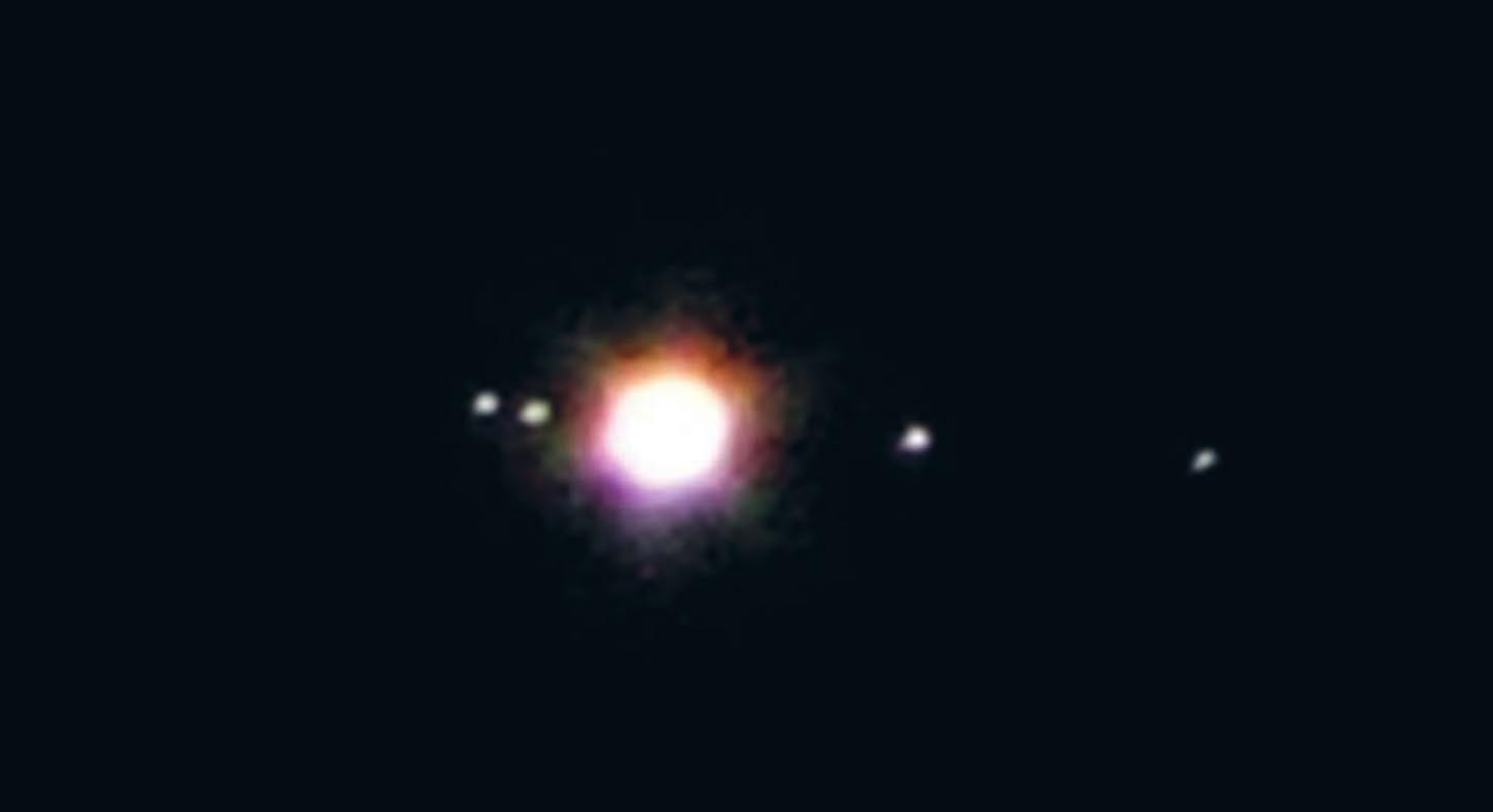 图2.2 木星以及伽利略在1610年发现的四颗“美第奇”卫星,通过使用改进过的天文望远镜,伽利略能将天体的影像放大至20~30倍。木卫一“艾奥”(Io)是距离木星最近的卫星,它环绕木星一周的时间为42小时27分21秒。这张照片是用三脚架上的简易数字相机拍摄的。(© Igor Dotsenko )