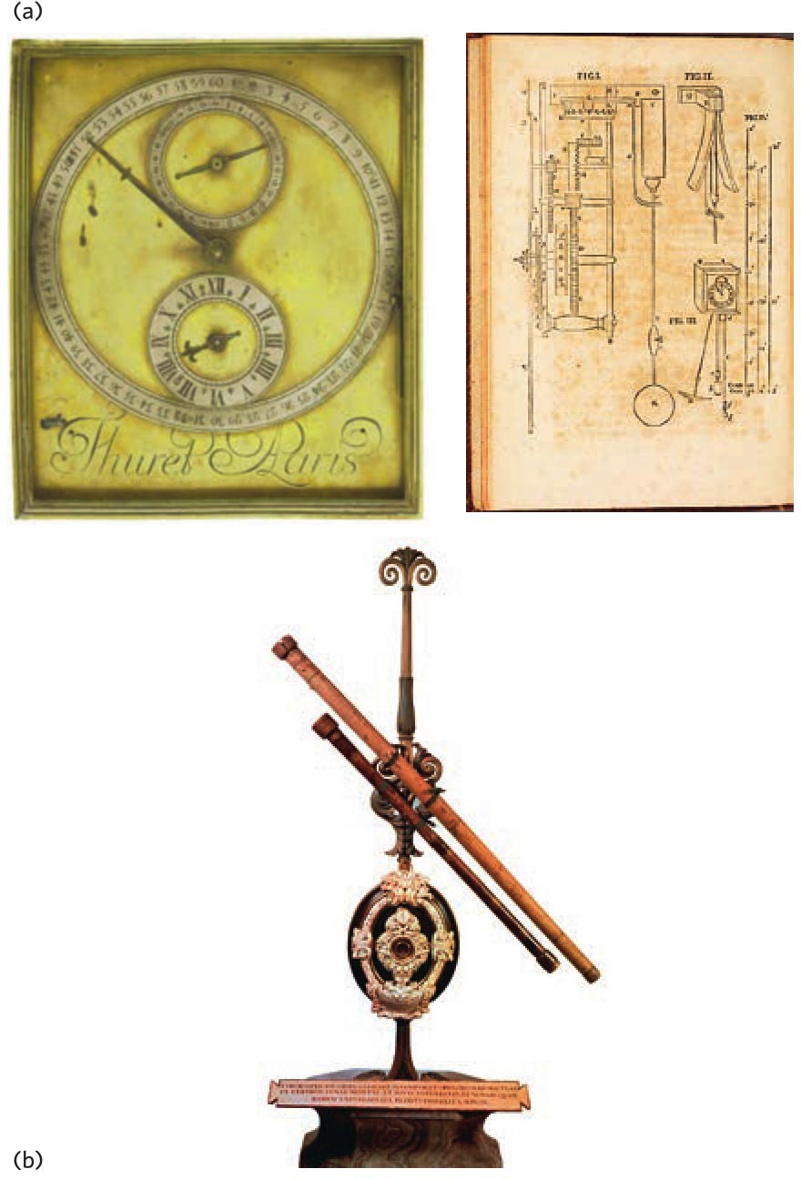图2.1 见证现代物理学诞生源头的两台仪器。(a)惠更斯摆钟:左边是皇家制表师伊萨克·图雷(Isaac Thuret)根据惠更斯的设计图制作的时钟表盘(存于荷兰莱顿的布尔哈夫博物馆),右边是惠更斯绘制的、详细说明该时钟运行机制的图纸。(b)伽利略的望远镜,通过它,他观测了月球、木星及其卫星(现存于佛罗伦萨的伽利略博物馆)。(© akg-images )