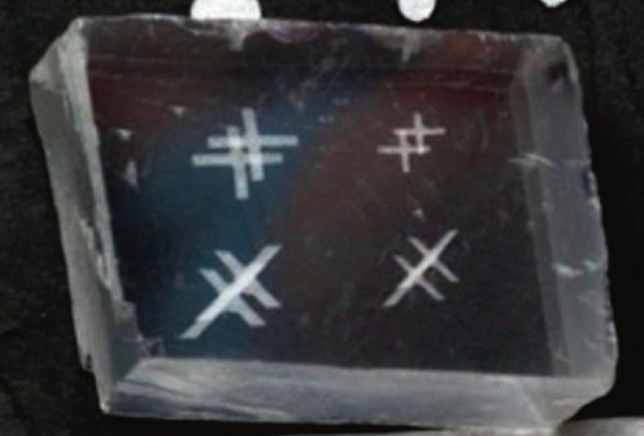 图2.8 冰洲石晶体的双折射现象:在黑板上画的每个十字都在透射时给出了两个偏振方向相互垂直的像。