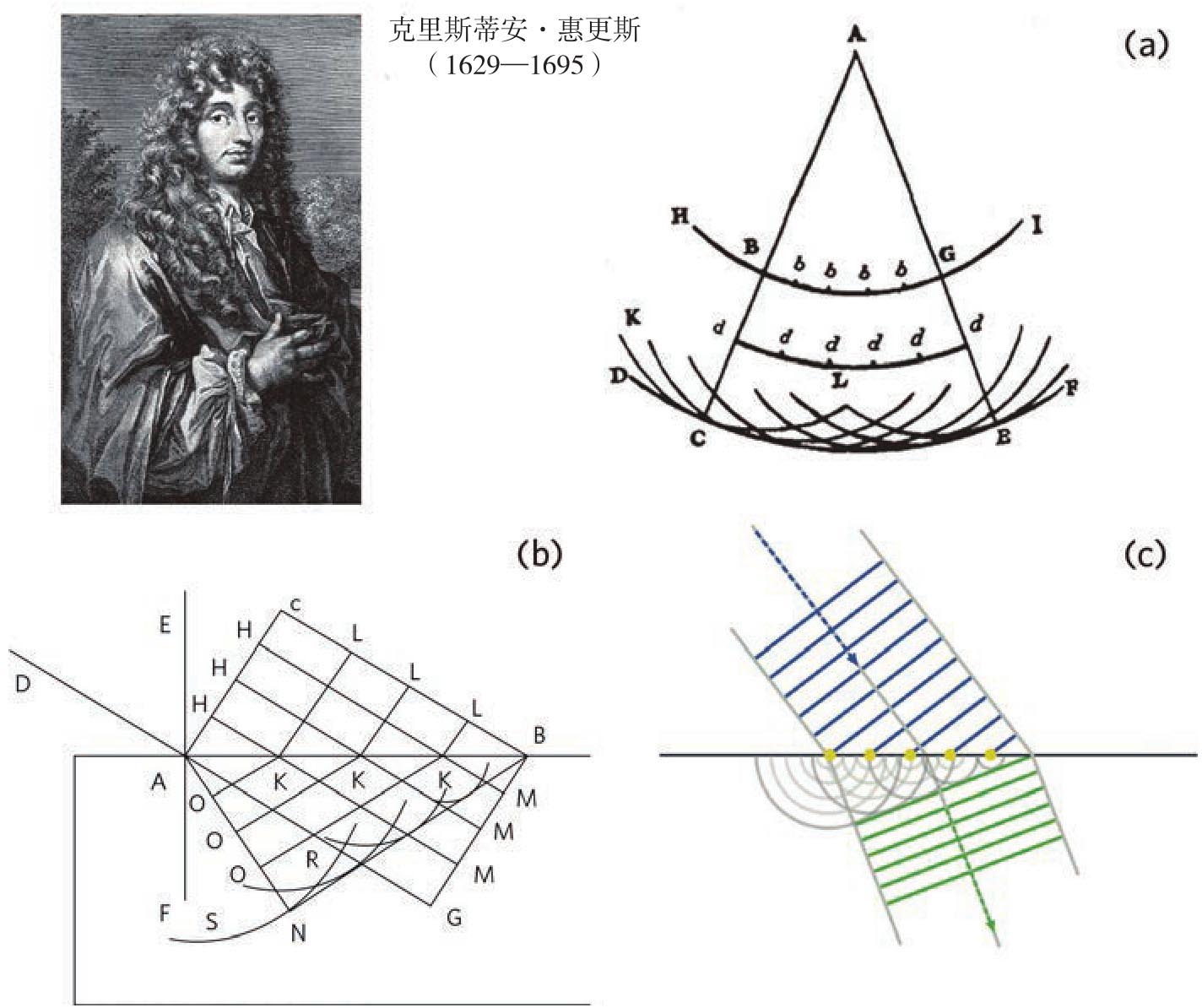 图2.7(a)《光论》中的插图,说明了惠更斯原理:光源A发出的光波超过球形波阵面之外的部分,以分布在这个波阵面上的虚拟光源所发出的次波的包络线的形式呈现。(b)根据《光论》绘制的示意图,显示了光从空气(上方)进入折射率 n >1的介质(下方)中的折射定律:与屈光面呈倾斜角的平面波的波阵面在相同的时间间隔下,抵达了屈光面上的一系列K点。每一个K点都向下层的介质辐射一个波。这些波的包络线形成一系列平行的平面,平面间距比在空气中时更窄。在下层介质中,光线垂直于这些平面,对应于一个比入射角更小的折射角。(c)一种简化的表示方法,明确地显示了入射的平面波在相继的瞬间内到达屈光面上的每个点后所发出的次级球面波(图片来自维基共享资源)。