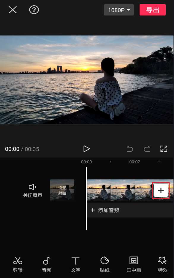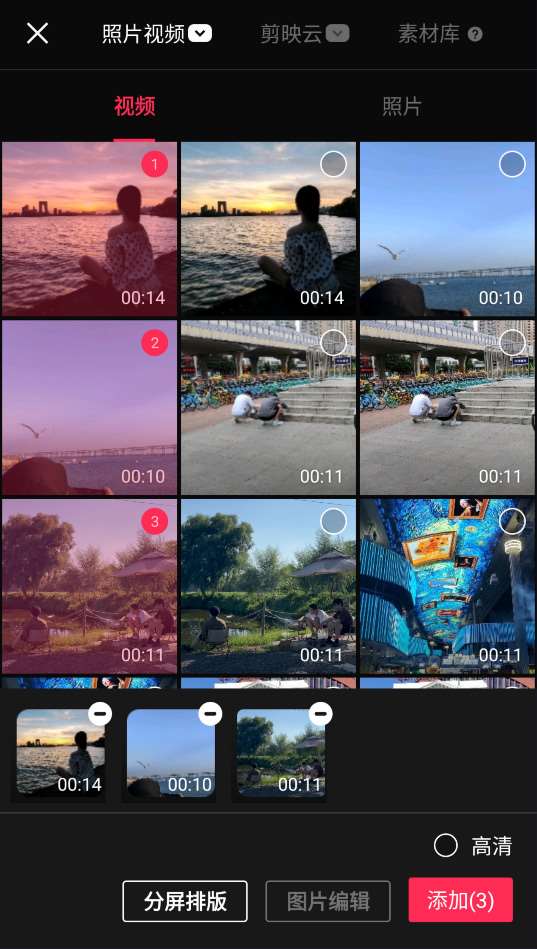 点击主页界面的“开始创作”,进入素材选取界面,如图2-1所示。以导入视频素材为例,点击视频素材右上角的灰色圆圈,当圆圈变为红色且中间出现数字时,该视频素材选择完成。可以一次选择复数素材,如图2-2所示。视频素材右上角圆圈中的数字表示素材导入剪辑界面时的排列顺序。视频素材选取完毕后,首先点击界面右下角的“高清”,这样,视频素材在导入剪辑界面后仍可以保持较高的清晰度,然后点击右下角的“添加”。当界面跳转至剪辑界面,且视频素材内容出现在轨道区时,如图2-3所示,则视频导入工作完成。如果想再次导入视频素材,点击图2-3轨道区右侧红色方框内的“+”,即可重新进入素材选取界面,之后,重复上述操作即可。