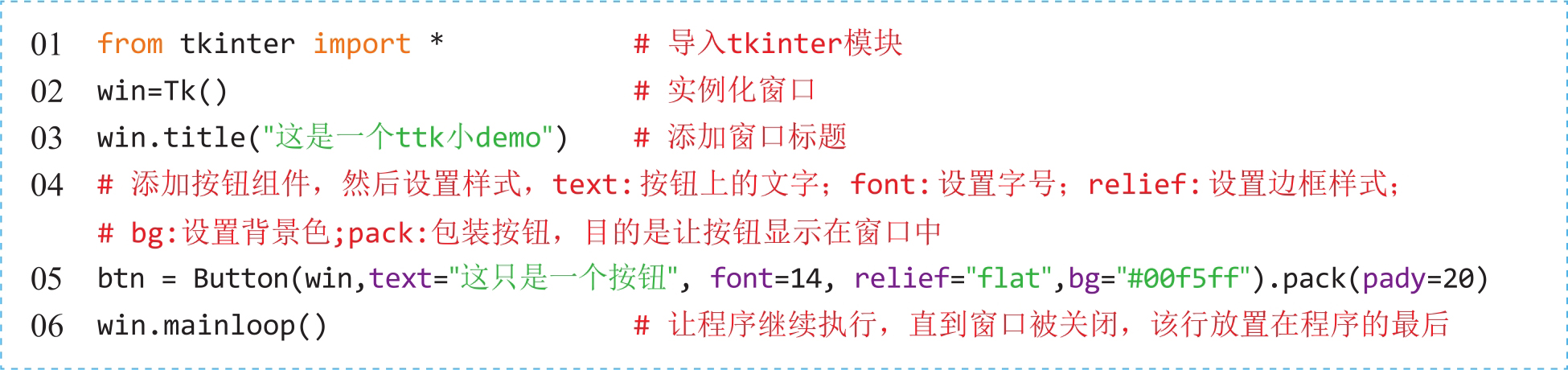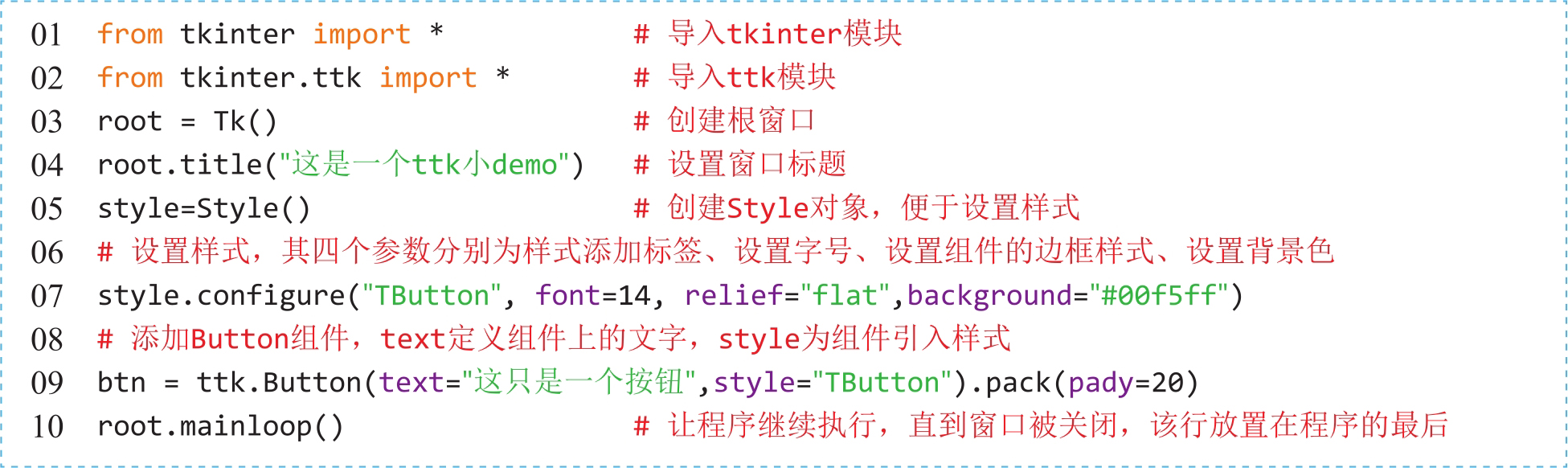 在窗口中添加一个ttk模块的Button组件,并且设置与实例2.1相同的样式。首先,创建Python文件,命名为demo2.py,然后在该文件中导入tkinter模块和ttk模块,最后添加组件并设置样式。具体代码如下: