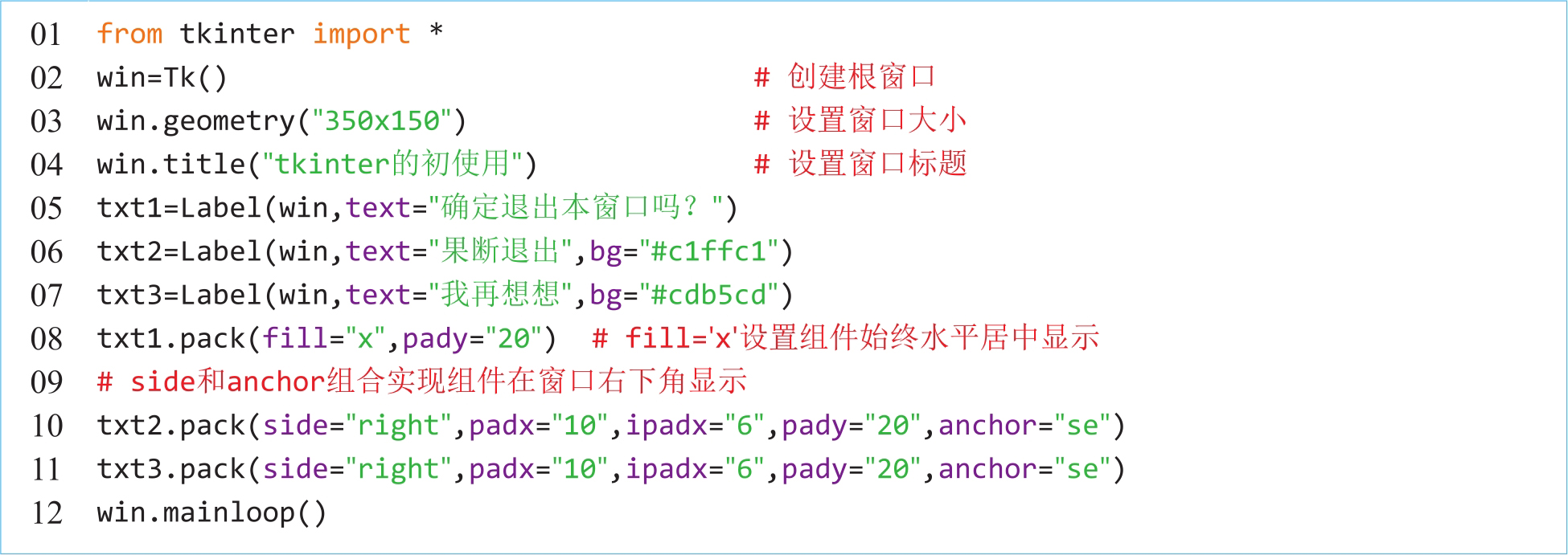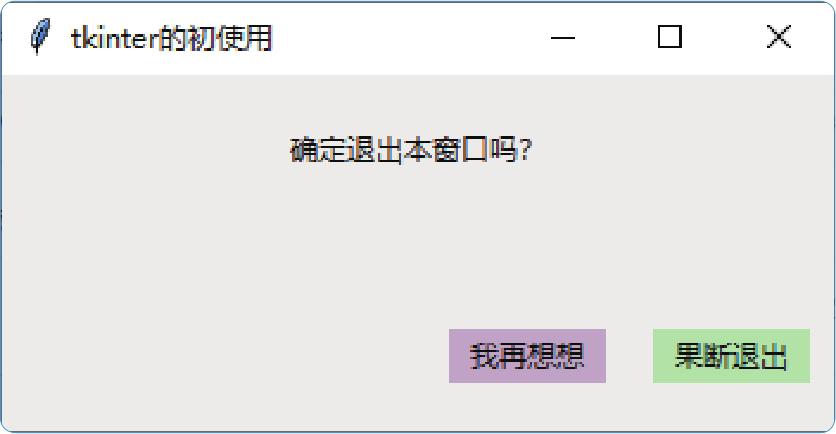 模拟确认退出本窗口的对话框,并且将“我再想想”和“果断退出”按钮置于窗口右下角(按钮使用Label组件实现)。具体代码如下: