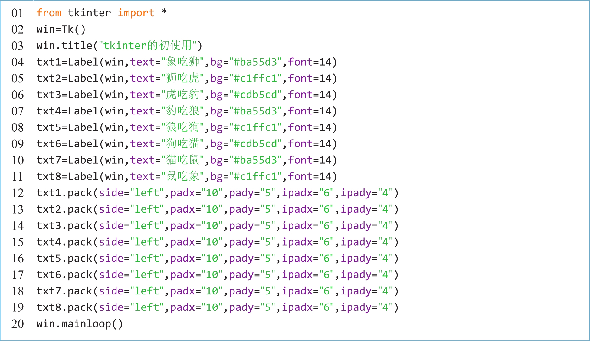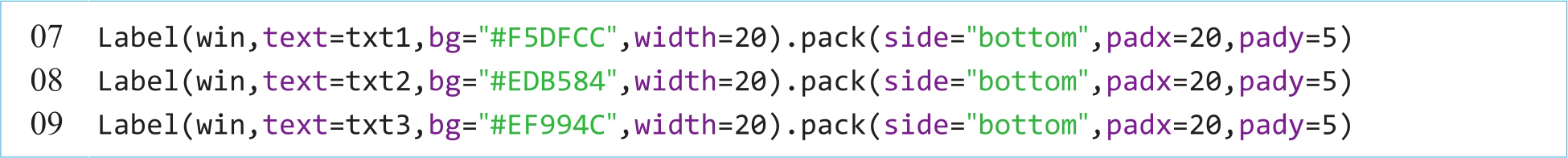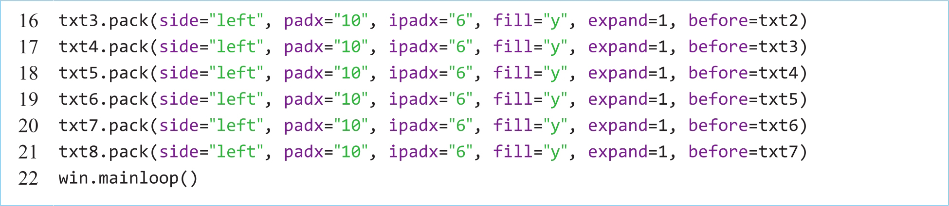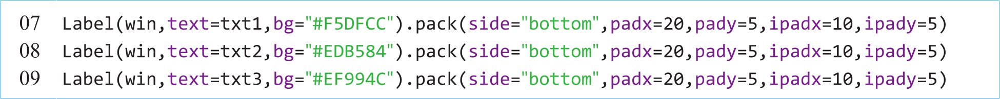 例如,设置实例4.1中的三个组件内的文字距离组件边界的水平间距为10像素、垂直间距为5像素,距离窗口的水平距离为20像素、垂直距离为5像素。只需要将实例4.1的第7~9行代码修改为以下代码: