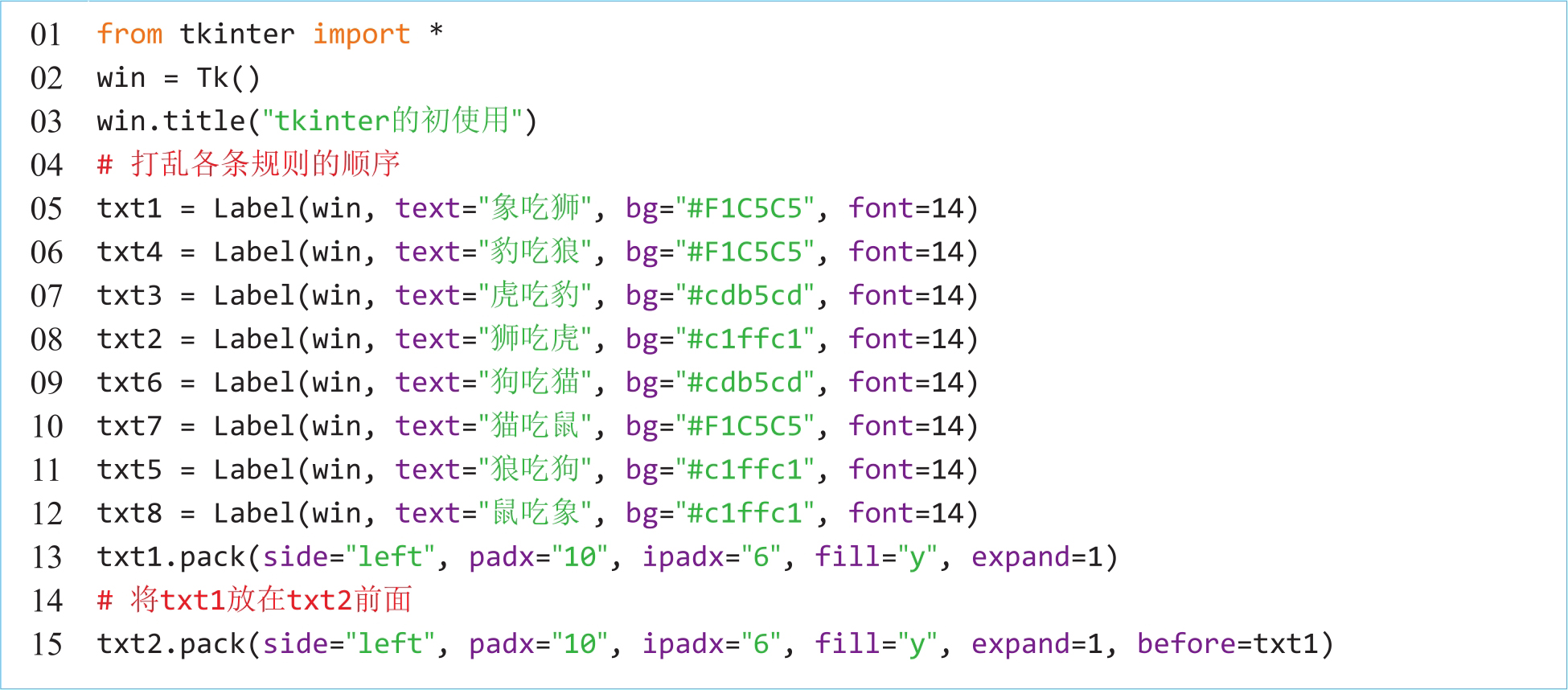上述代码将各组件的排列顺序打乱,然后在pack()方法中通过before参数依次设置各组件的排列顺序,其运行效果与图4.8所示相同。
