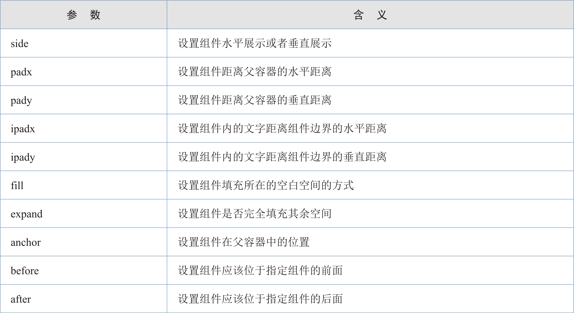 上面语法中widget为需要布局的组件,options为pack()方法的相关参数。