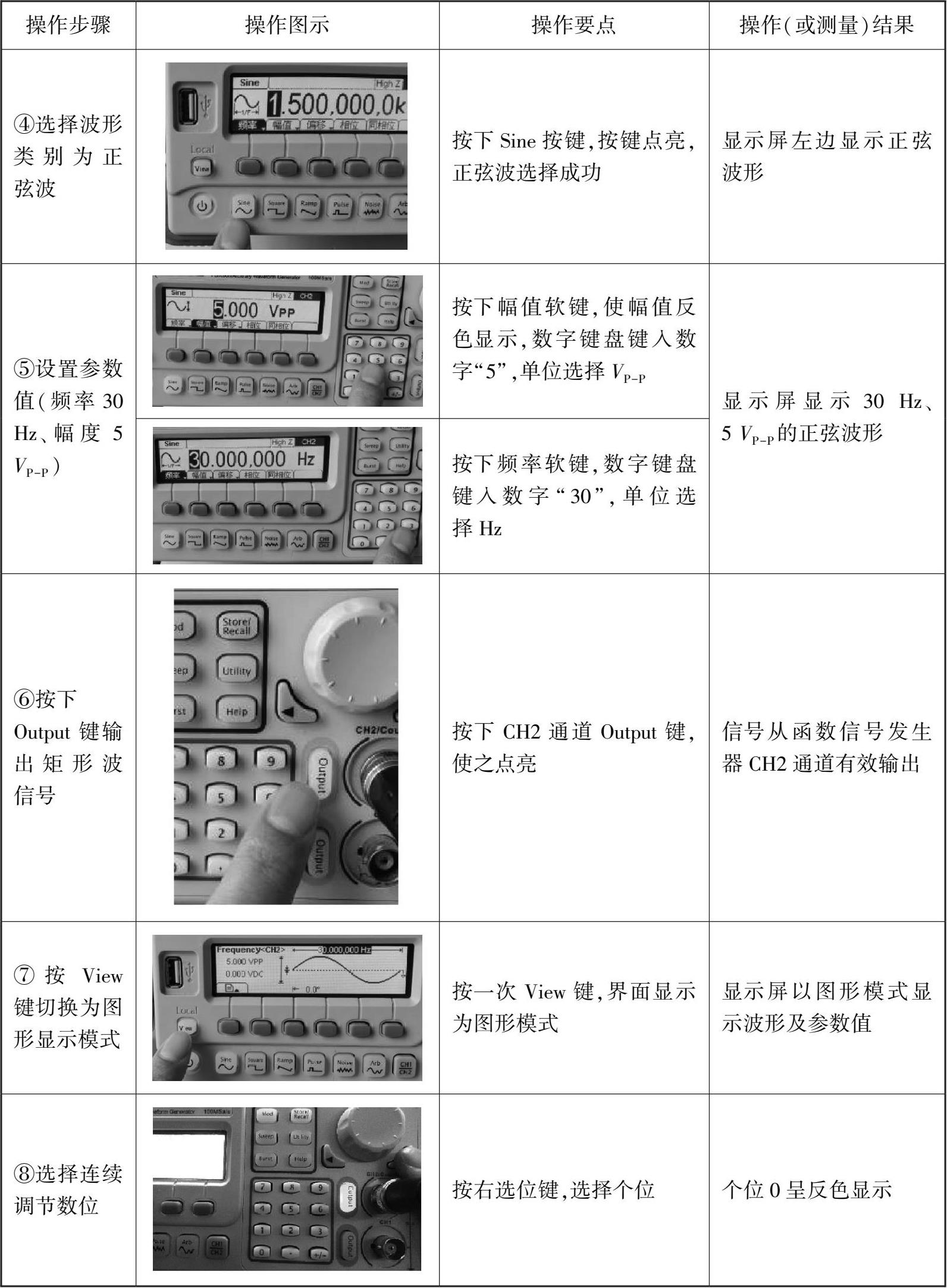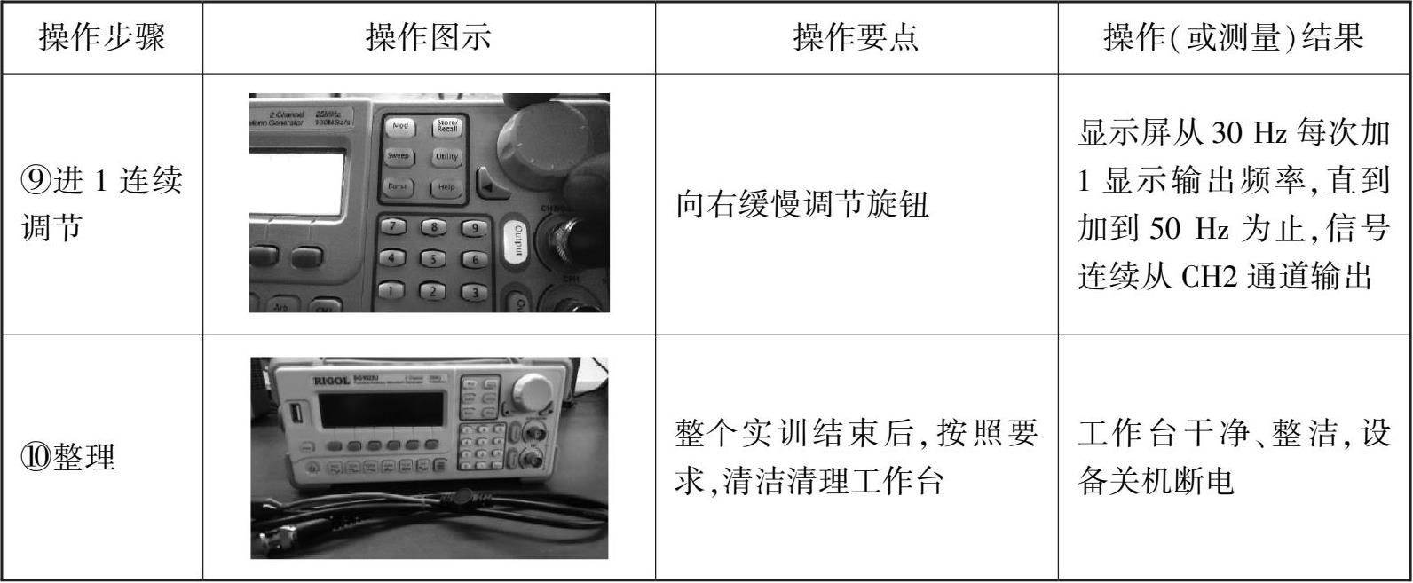 以使用DG1022U型函数信号发生器完成从CH2 通道输出频率为 30 ~ 50 Hz连续可调,幅度为 5 V P-P 的正弦波的设置为例讲解其操作方法,见表 3-20。