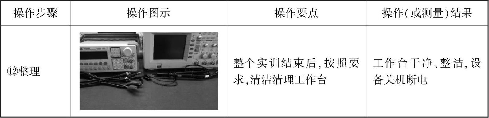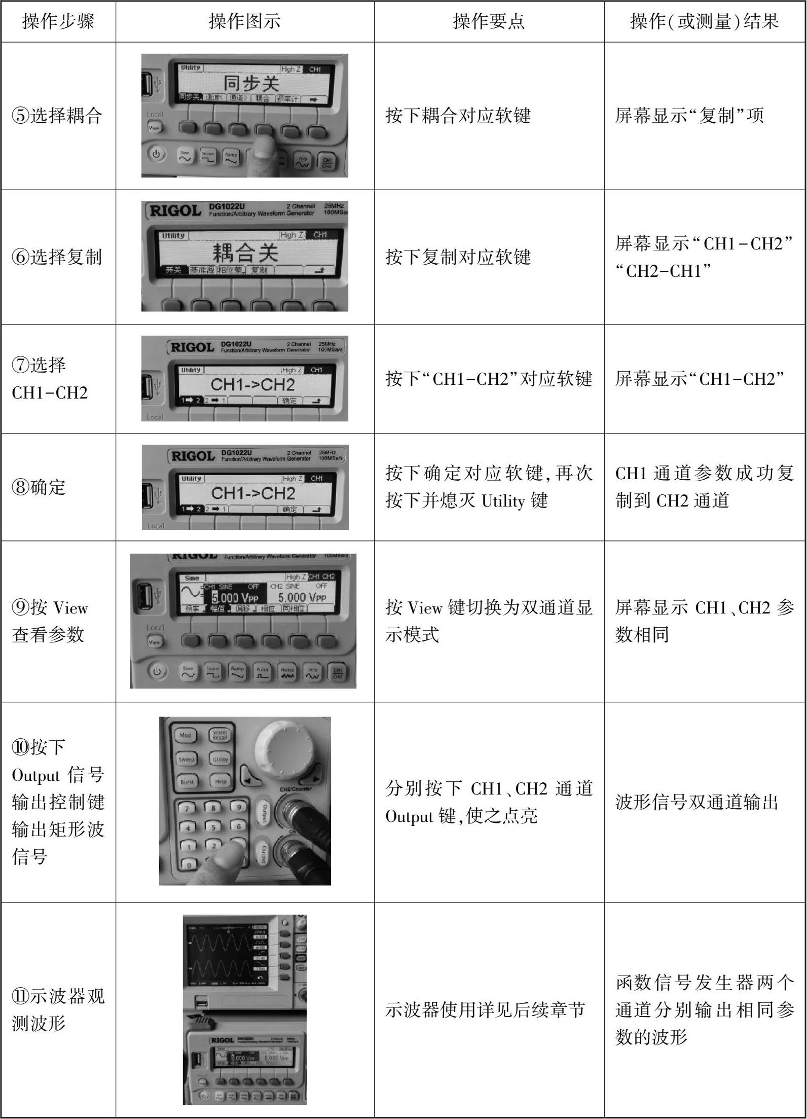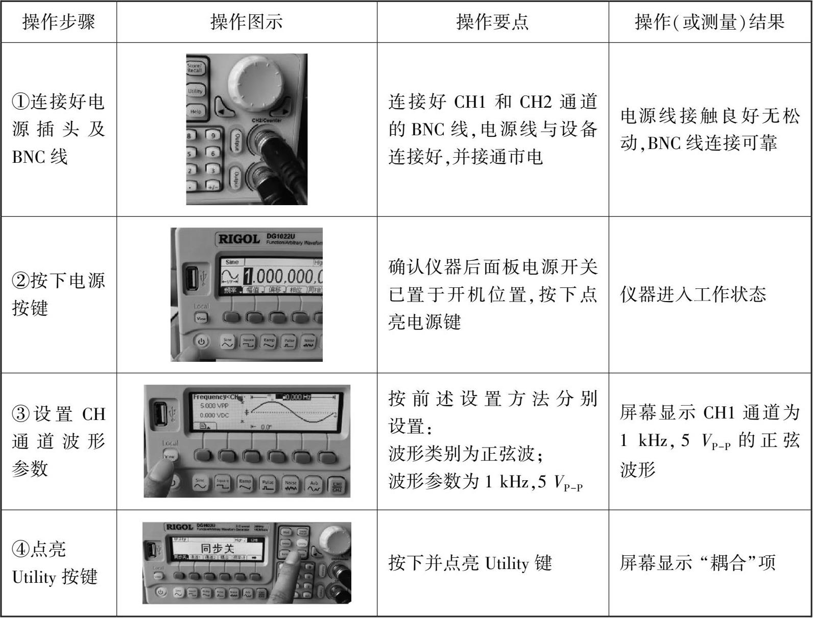 以使用DG1022U型函数信号发生器同时从CH1、CH2 通道输出频率为 1 kHz,幅度为4 V P-P 的正弦波的为例讲解其操作方法,见表 3-21。