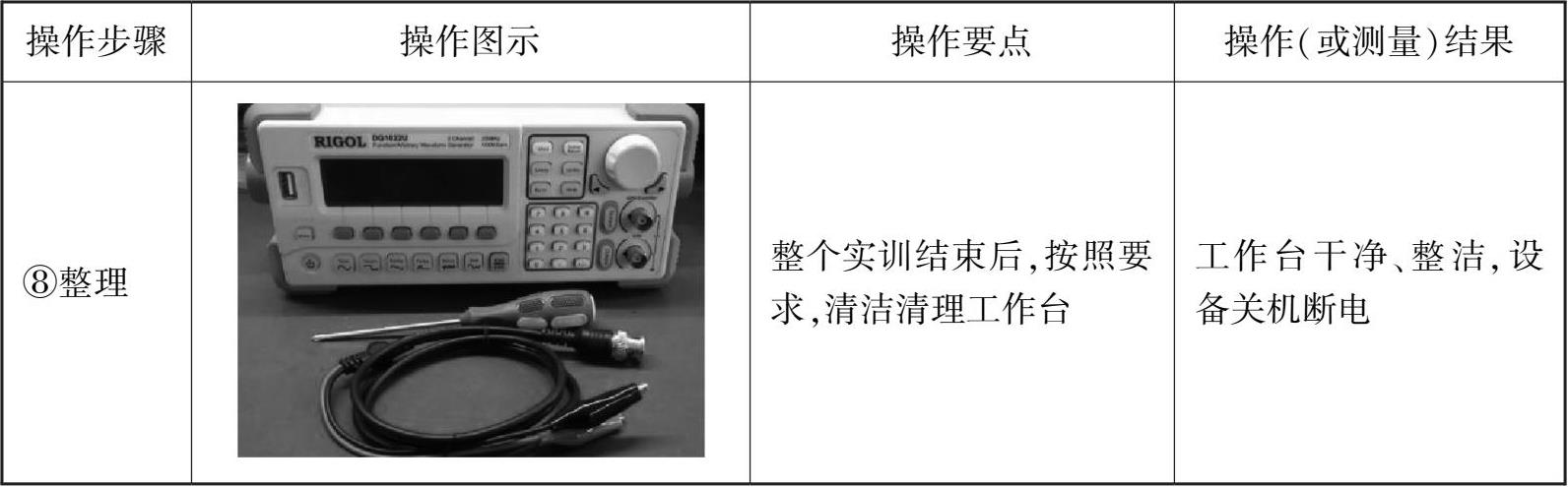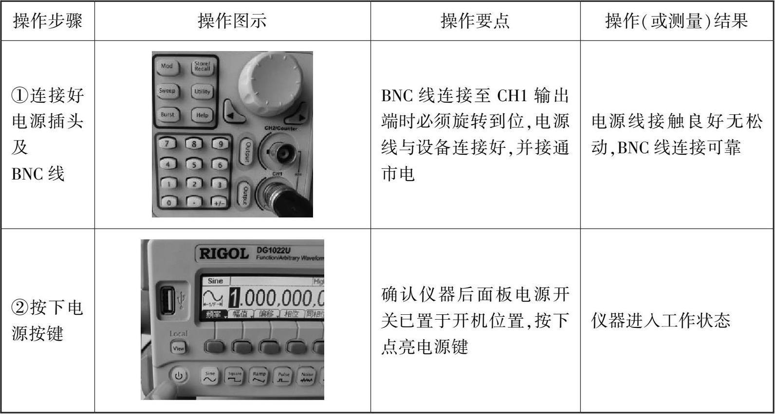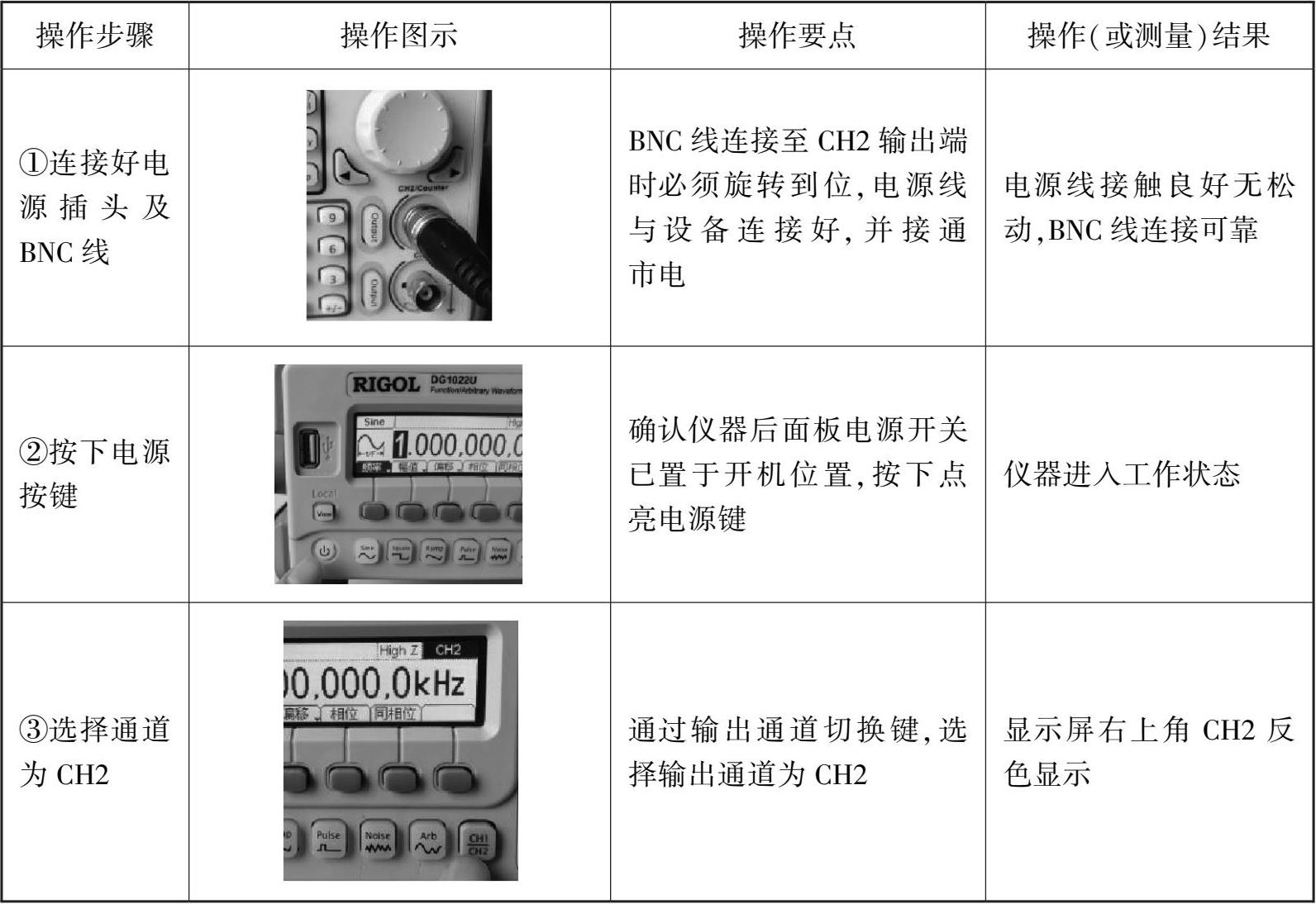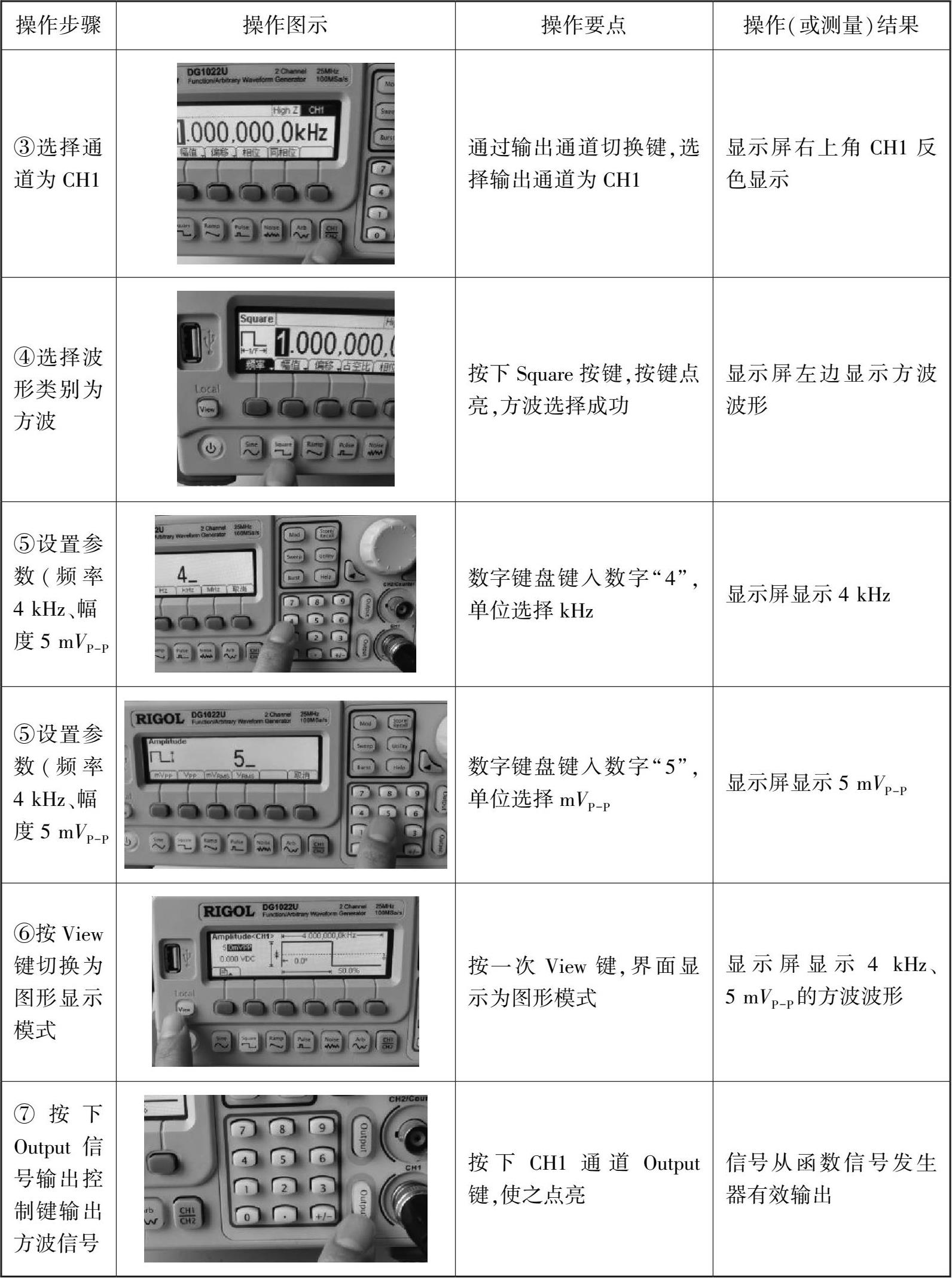 以使用DG1022U型函数信号发生器设置从CH1 通道输出频率为 4 kHz,幅度为5 m V P-P 的方波为例讲解其操作方法,见表 3-19。
