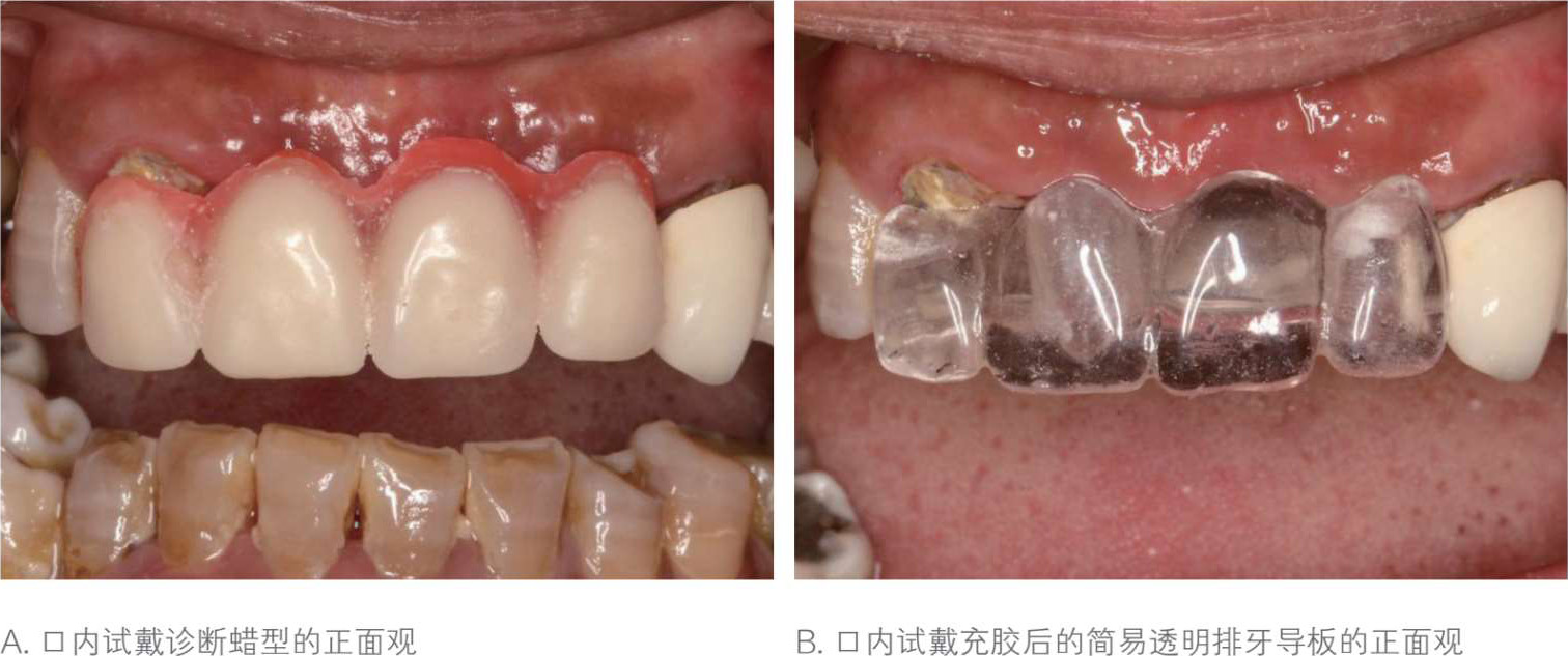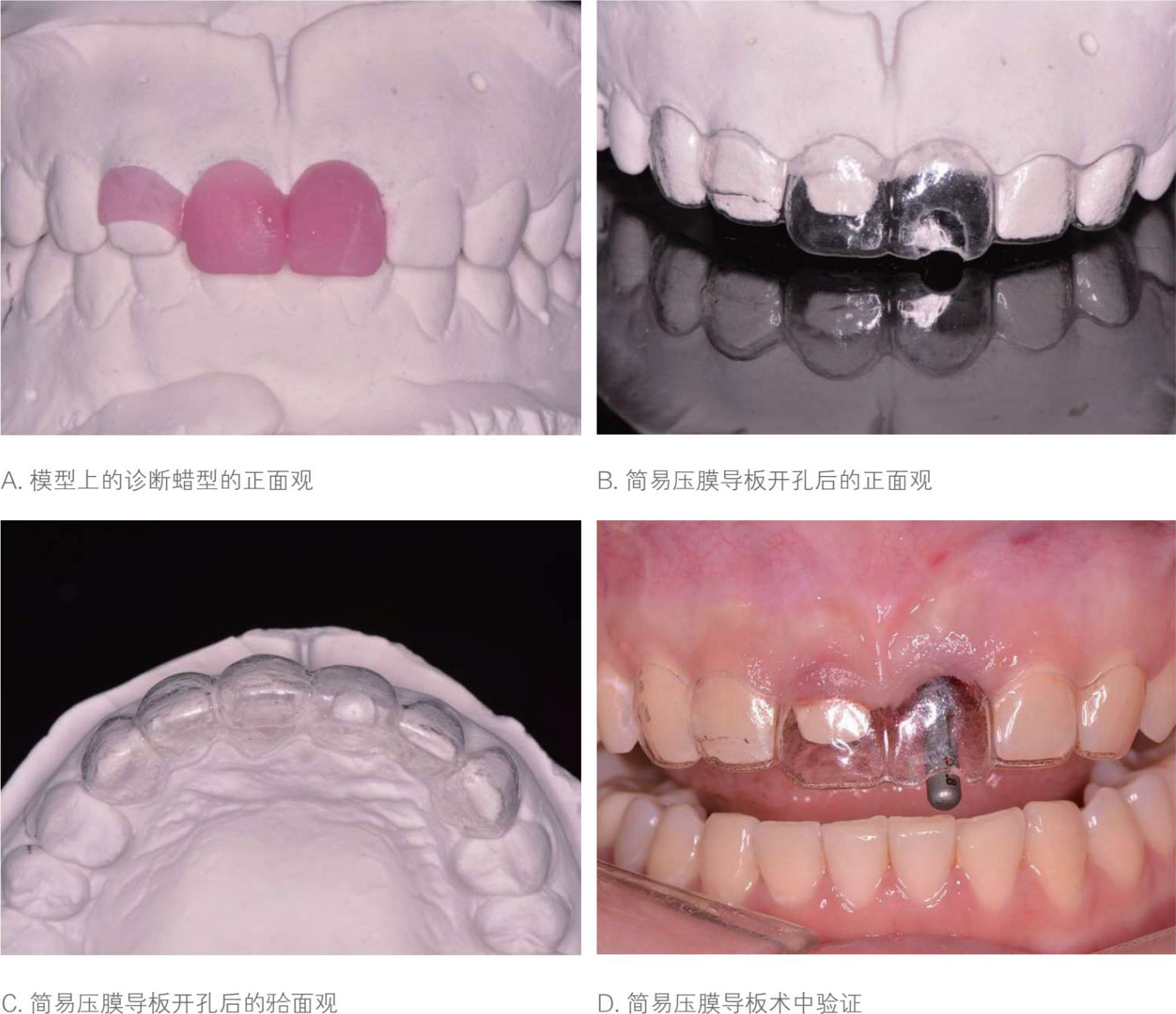 在临床上,设计与预告最终修复效果的最直接方式是在石膏模型上用美学蜡或树脂牙进行理想排牙。在此基础上,医生可以在所排缺失牙的中心长轴上开孔作为种植体植入位点参照,制作成简易透明排牙导板(图 1-1-8),或对排牙模型翻制石膏模型后,压制透明膜片成型,从石膏模型上切割剪裁下来,并在相应位点开孔,生成类似正畸压膜保持器的简易压膜导板(图 1-1-9)。与基于个人经验的自由手种植相比,石膏模型上的排牙操作具有可视化评估功能,并且导板的开孔可为种植体植入位点的确定提供一定近远中和颊舌方向上的参考,因此以上两种简易种植导板在“以修复为导向”方面有了一定改善。但需要明确指出的是,简易种植导板由于无法实现牙列软硬组织信息与颌骨影像学信息重叠对应,难以从现实世界进入可视化的虚拟世界,种植位点的精准设计和具有约束引导功能的种植导板设计也无从谈起,同时简易种植导板对种植体植入方向的引导作用十分有限,所以仅能践行“以修复为导向”标准流程中的第一步,难以实施其后三个步骤。