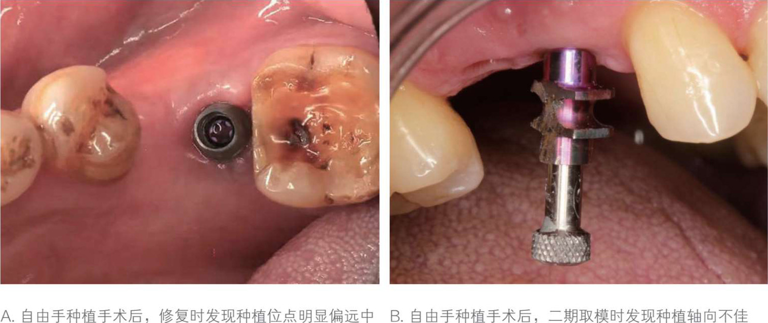 图1-1-7 传统自由手种植导致种植位点和轴向出现偏差