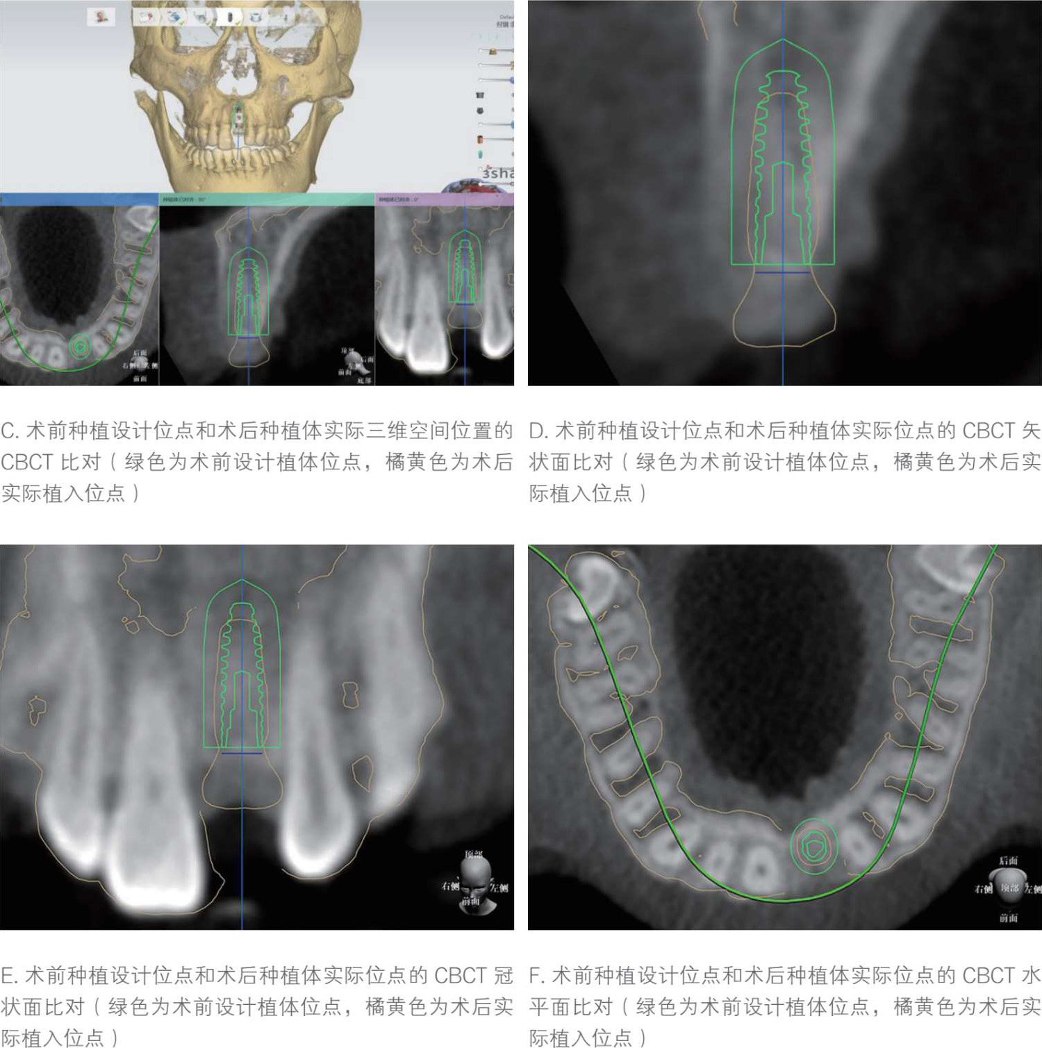 在种植手术及修复完成后,通过对比修复体的虚拟设计和实际效果(图 1-1-6 A,图 1-1-6 B),以及种植体的虚拟设计与实际位置(图 1-1-6 C—图 1-1-6 F),实现虚拟设计与实际效果的对比验证,并分析出现偏差的原因,从而获得临床技术步骤的效果验证与反馈。