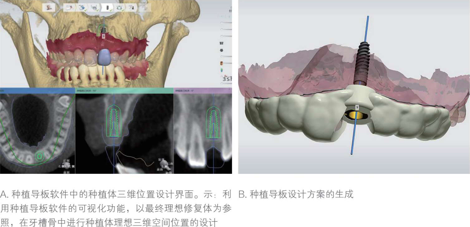 在可视化状态下,以最终理想修复体为参照,根据种植体植入原则,在牙槽骨(颌骨)中精准地设计种植体的理想三维空间位置(图 1-1-4 A)。然后生成具有约束引导种植体植入作用的种植导板虚拟文件,并通过 3D打印等技术制作出实体种植导板(图 1-1-4 B)。