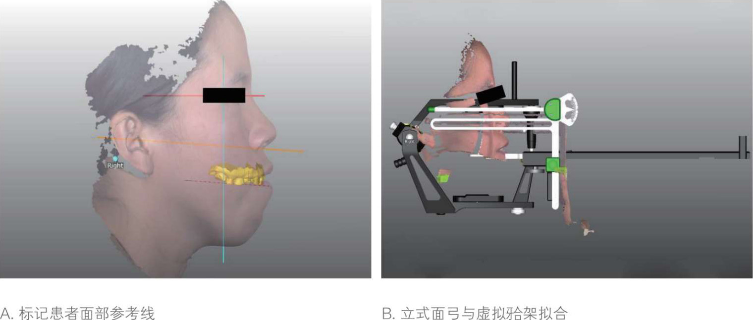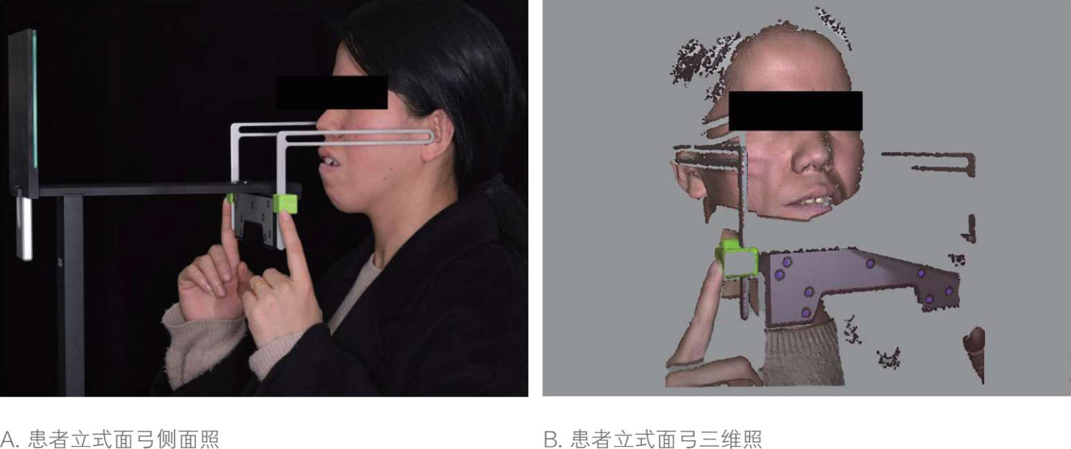 将立式面弓的图像数据与患者无表情正面三维面部的虚拟模型相互拟合,拟合后得到患者立式面弓的面部空间位置信息。为了提高拟合转移精确度,临床上往往通过获取多张立式面弓拍摄数据,来计算立式面弓转移的平均值,一般拍摄数量为 5~8 张(图 2-2-9)。