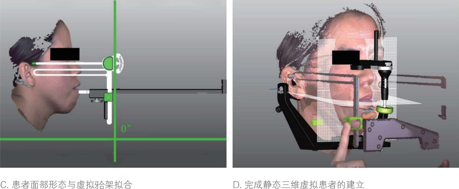 架就会自动移动到与患者面部信息、颌骨信息、口内软硬组织信息相对应的实际空间位置上(图 2-2-13),即完成个性化静态三维虚拟患者的建立。