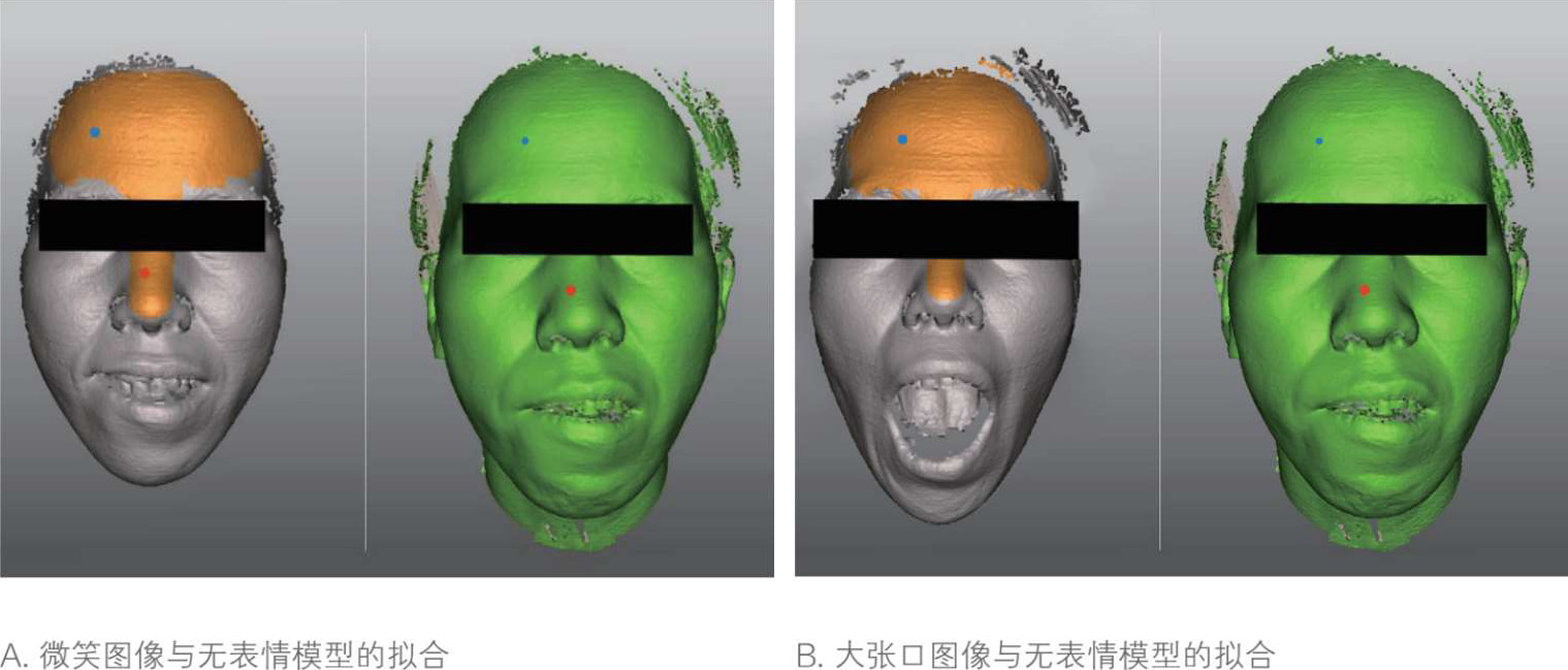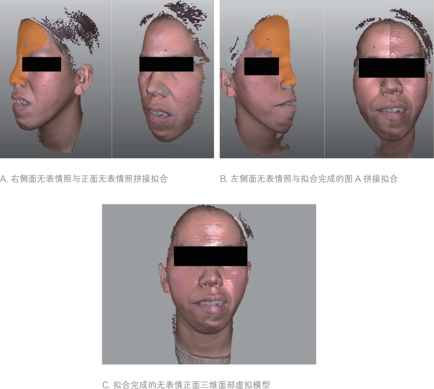 将微笑照、大张口照或发音位照分别与患者无表情正面三维面部的虚拟模型匹配,选取共同区域进行拟合。需要注意的是由于患者在做表情动作时,脸部肌肉会发生变形,为了达到精准拟合的效果,通常要选取额头和鼻梁等在各种表情状态下形态一致的面部区域来进行图像拟合(图 2-2-8)。