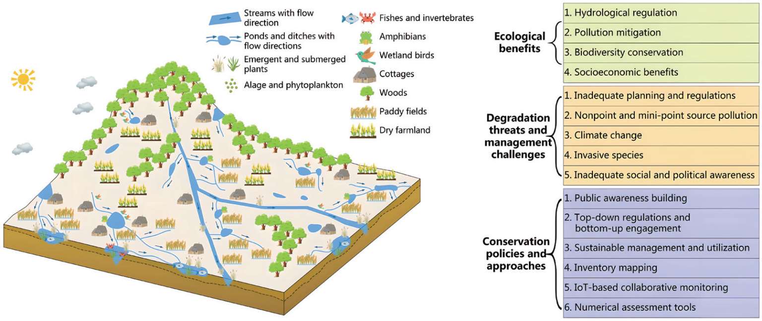 Farm ponds are small (1 m 2 to approximately 0.05 km 2 ), shallow (< 8 m), natural or man-made surface depressions that permanently or temporarily hold water. They are frequently seen in agricultural regions in many countries(Yin and Shan, 2001; Céréghino et al., 2014; Grobicki et al., 2016). Owing to the low construction cost, high irrigation and drainage efficiency, and value for multiple uses, including drinking, fishing and washing, farm ponds have played an important role during the development of human civilization (Miller,2009; Mushet et al., 2014; Chen et al., 2018). In recent decades, however, the development of reservoir-based water systems has gradually weakened the importance of farm ponds in water supply. Many areas that were once farm ponds have been filled as a result of expanding urbanization (Huang et al., 2012;Hill et al., 2018) and agricultural intensification (Calhoun et al., 2014; Poschlod and Braun-Reichert, 2017) or have become isolated from one another due to the modification of ditches and streams (Fang et al., 2014). Thus, some obvious questions arise: Do farm ponds have functions beyond those of irrigation and water supply? Should they be conserved from contemporary degradation, and what are the challenges and solutions?
