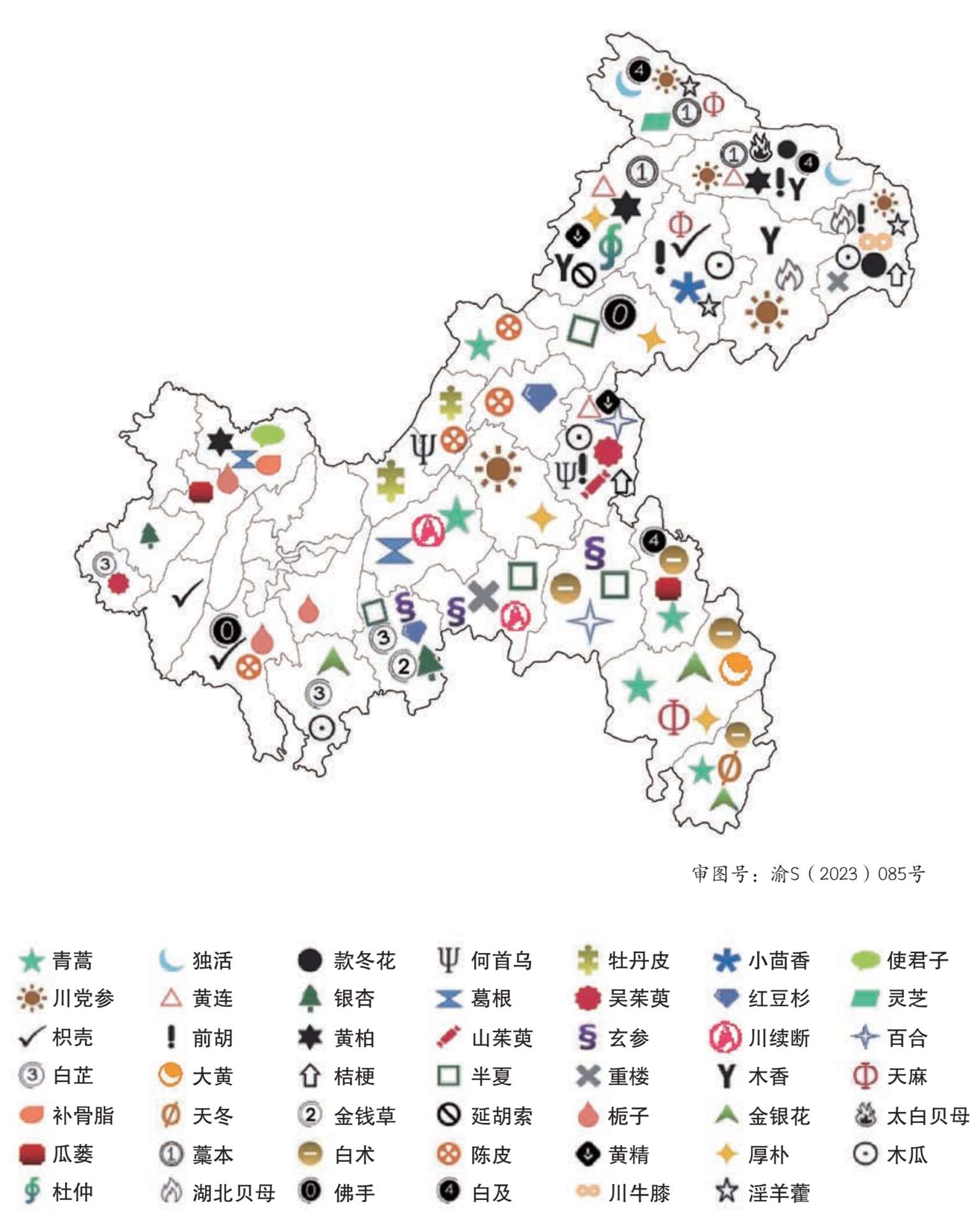 中药材种植业是农业的重要组成部分,是我国也是我市中医药事业发展的基础,中药材消耗总量的70%以上来源于人工种植,重庆是我国重要的中药材产区,人工种植历史悠久,自国家启动中药现代化发展战略以来,得到了前所未有的发展,区域布局如图1所示。其中属重庆道地药材且栽培面积较大的有35种,除主城及潼南和万盛外,重庆市各区县均有中药材种植,主要分布于石柱、丰都、巫山、巫溪、奉节、酉阳、秀山、江津、武隆、綦江、合川等20多个区县,并以渝东北和渝东南分布最为集中。其中,黄连、木香、牡丹皮、白术、枳壳、款冬花、党参、小茴香、天麻、半夏、青蒿、厚朴、黄柏、独活等为国家重点发展品种;金银花、银杏、吴茱萸、佛手、红豆杉、辛夷、前胡等20多个品种为市级重点发展品种。