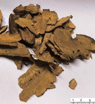 【性状】 本品多为圆柱形短段或不规则厚片,长1~7cm,直径0.5~2.5cm。外皮棕褐色,有纵皱纹和须根痕,切面皮部较薄,木部宽广,棕黄色,射线放射状,皮部与木部较易分离。根茎髓中有隔或呈空洞状。质坚硬。气微,味微苦、涩。
