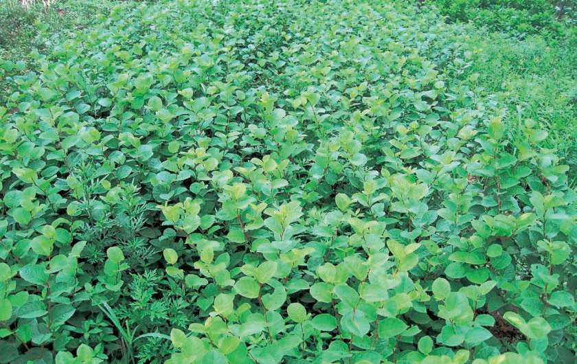 深翻扩穴主要对林地虎杖进行,在秋季枯萎落叶后沿植株根系生长点外围开始,逐年向外扩展40~50cm。回填时混以绿肥或腐熟有机肥等,表土放在底层,心土放在表层。