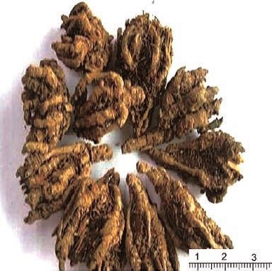 【性状】 味连多集聚成簇,常弯曲,形如鸡爪,单枝根茎长3~6cm,直径0.3~0.8cm。表面灰黄色或黄褐色,粗糙,有不规则结节状隆起、须根及须根残基,有的节间表面平滑如茎秆,习称“过桥”。上部多残留褐色鳞叶,顶端常留有残余的茎或叶柄。质硬,断面不整齐,皮部橙红色或暗棕色,木部鲜黄色或橙黄色,呈放射状排列,髓部有的中空。气微,味极苦。