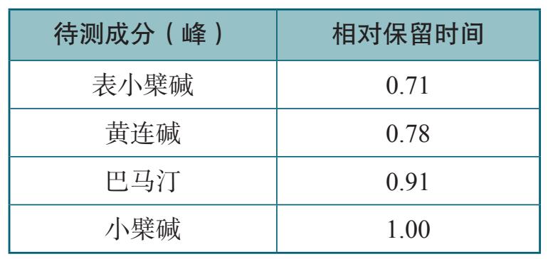 表小檗碱、黄连碱、巴马汀、小檗碱的峰位,其相对保留时间应在规定值的±5%范围之内,即得。相对保留时间见下表。