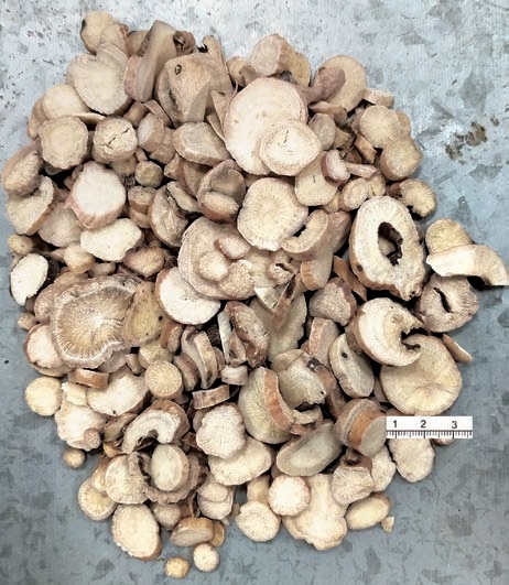 【性状】 本品呈圆柱形,平直或稍弯曲,两端平截,长5~18cm,直径1~2.5cm。表面类白色或淡棕红色,光洁或有纵皱纹及细根痕,偶有残存的棕褐色外皮。质坚实,不易折断,断面较平坦,类白色或微带棕红色,形成层环明显,射线放射状。气微,味微苦、酸。