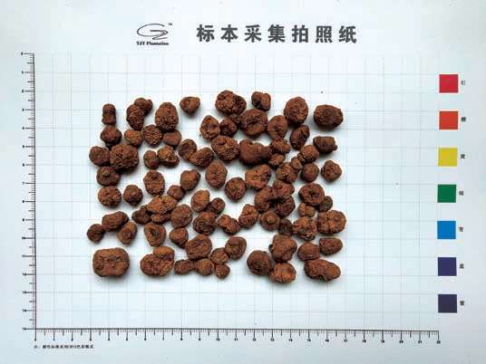 【性状】 本品呈不规则的扁球形,直径0.5~1.5cm。表面黄色或黄褐色,有不规则网状皱纹。顶端有略凹陷的茎痕,底部常有疙瘩状突起。质硬而脆,断面黄色,角质样,有蜡样光泽。气微,味苦。