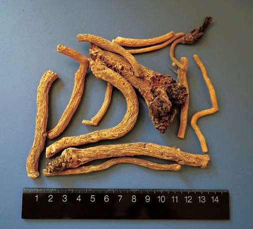 【性状】 本品呈圆柱形,稍扭曲,长10~20cm,直径0.5~1cm。表面淡灰黄色或淡棕黄色,有纵皱纹、横长皮孔样突起及支根痕。根头略膨大,可见暗绿色或暗棕色轮状排列的叶柄残基和密集的疣状突起。体实,质略软,断面皮部黄白色,木部黄色。气微,味微甜后苦涩。
