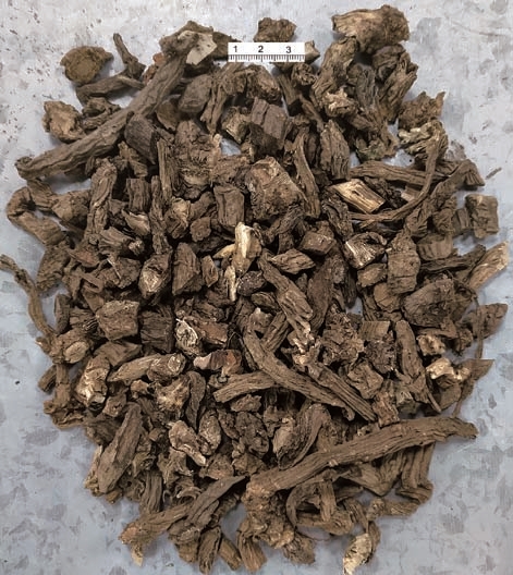 【性状】 本品根长圆柱形,略扁,微弯,长5~15cm,直径0.5~2cm,表面红褐色或灰褐色,有多数明显而扭曲的纵皱纹及沟纹,并可见横长皮孔及少数须根痕。质稍软,久置干燥后变硬。易折断,断面不平坦,皮部绿褐色或浅褐色,木部黄褐色,可见放射状花纹。气微香,味苦,微甜而后涩。