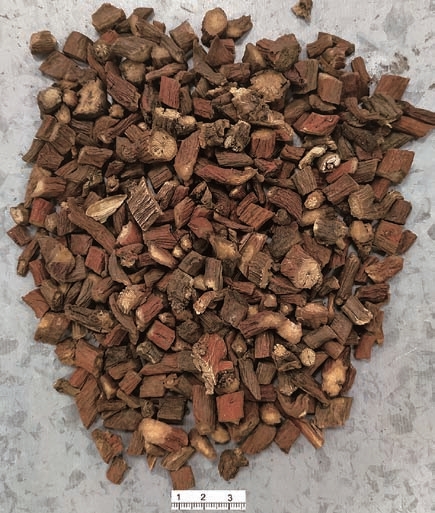 【性状】 本品根茎短粗,顶端有时残留茎基。根数条,长圆柱形,略弯曲,有的分枝并具须状细根,长10~20cm,直径0.3~1cm。表面棕红色或暗棕红色,粗糙,具纵皱纹。老根外皮疏松,多显紫棕色,常呈鳞片状剥落。质硬而脆,断面疏松,有裂隙或略平整而致密,皮部棕红色,木部灰黄色或紫褐色,导管束黄白色,呈放射状排列。气微,味微苦涩。栽培品较粗壮,直径0.5~1.5cm。表面红棕色,具纵皱纹,外皮紧贴不易剥落。质坚实,断面较平整,略呈角质样。