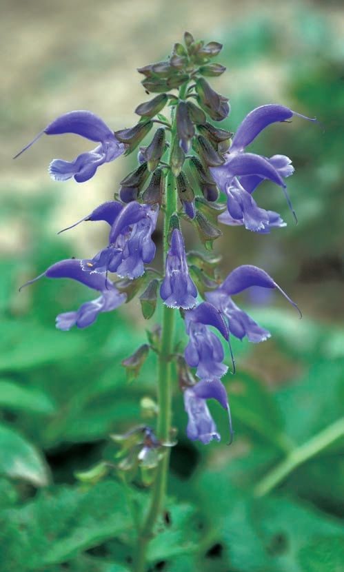 多年生直立草本;根肥厚,肉质,外面朱红色,内面白色,长5~15cm,直径4~14mm,疏生支根。茎直立,高40~80cm,四棱形,具槽,密被长柔毛,多分枝。叶常为奇数羽状复叶,叶柄长1.3~7.5cm,密被向下长柔毛,小叶3~5(7),长1.5~8cm,宽1~4cm,卵圆形或椭圆状卵圆形或宽披针形,先端锐尖或渐尖,基部圆形或偏斜,边缘具圆齿,草质,两面被疏柔毛,下面较密,小叶柄长2~14mm,与叶轴密被长柔毛。轮伞花序6花或多花,下部者疏离,上部者密集,组成长4.5~17cm具长梗的顶生或腋生总状花序;苞片披针形,先端渐尖,基部楔形,全缘,上面无毛,下面略被疏柔毛,比花梗长或短;花梗长3~4mm,花序轴密被长柔毛或具腺长柔毛。花萼钟形,带紫色,长约1.1cm,花后稍增大,外面被疏长柔毛及具腺长柔毛,具缘毛,内面中部密被白色长硬毛,具11脉,二唇形,上唇全缘,三角形,长约4mm,宽约8mm,先端具3个小尖头,侧脉外缘具狭翅,下唇与上唇近等长,深裂成2齿,齿三角形,先端渐尖。花冠紫蓝色,长2~2.7cm,外被具腺短柔毛,尤以上唇为密,内面离冠筒基部2~3mm有斜生不完全小疏柔毛毛环,冠筒外伸,比冠檐短,基部宽2mm,向上渐宽,至喉部宽达8mm,冠檐二唇形,上唇长12~15mm,镰刀状,向上竖立,先端微缺,下唇短于上唇,3裂,中裂片长5mm,宽达10mm,先端二裂,裂片顶端具不整齐的尖齿,侧裂片短,顶端圆形,宽约3mm。能育雄蕊2,伸至上唇片,花丝长3.5~4mm,药隔长17~20mm,中部关节处略被小疏柔毛,上臂十分伸长,长14~17mm,下臂短而增粗,药室不育,顶端联合。退化雄蕊线形,长约4mm。花柱远外伸,长达40mm,先端不相等2裂,后裂片极短,前裂片线形。花盘前方稍膨大。小坚果黑色,椭圆形,长约3.2cm,直径1.5mm。花期4—8月,花后见果。