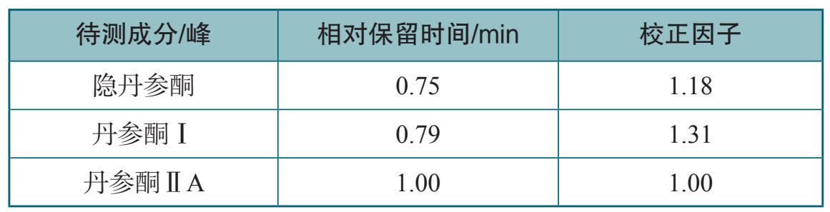 以丹参酮ⅡA的峰面积为对照,分别乘以校正因子,计算隐丹参酮、丹参酮Ⅰ、丹参酮ⅡA的含量。