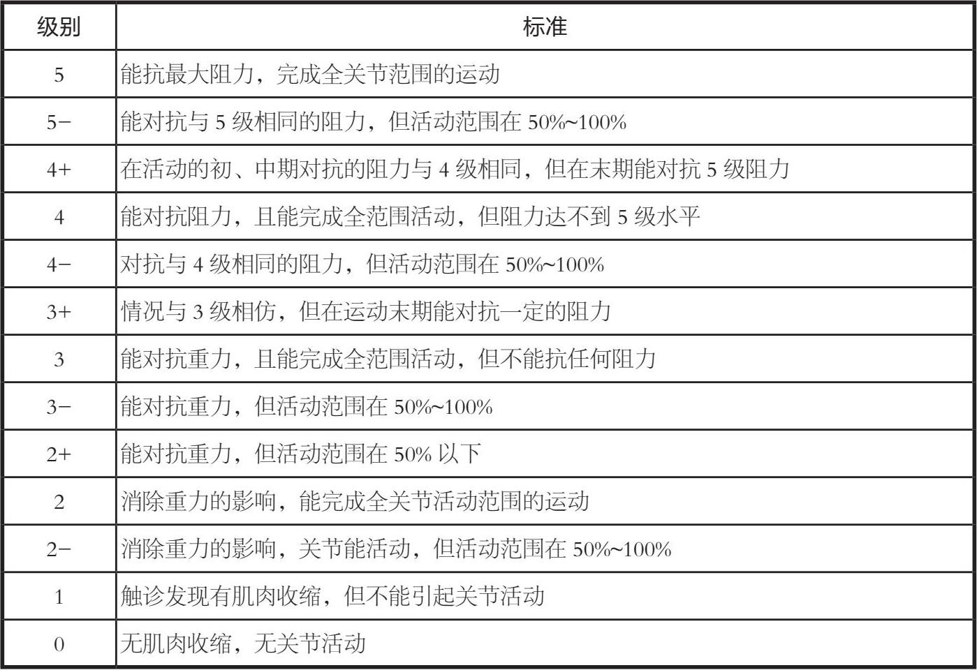 根据徒手肌力测试13级手法肌力分级标准,等级越高肌力水平越好。(表3-1)