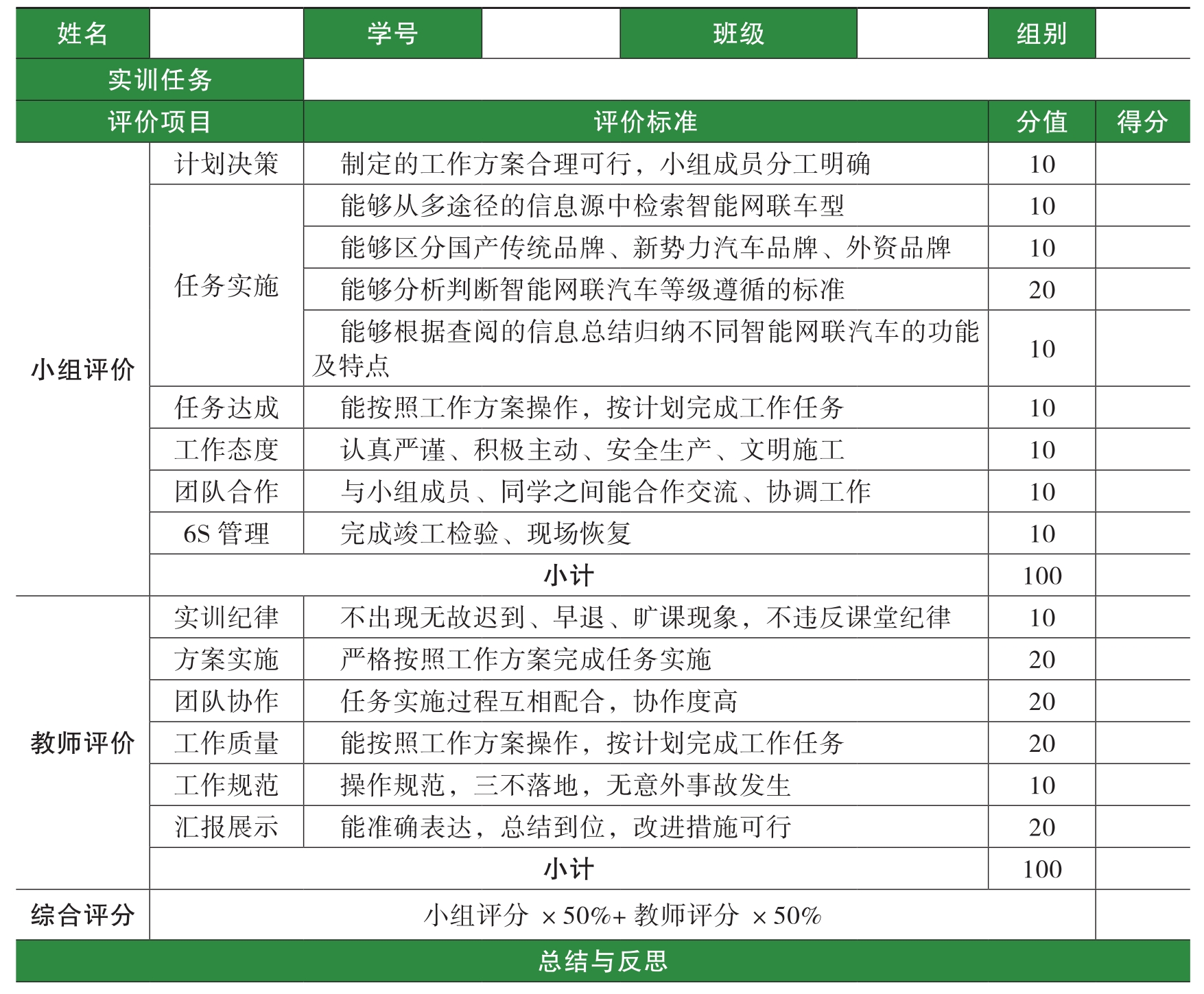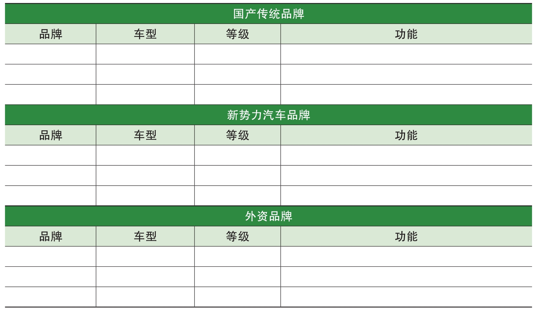 以小组为单位从国产传统品牌、新势力汽车品牌、外资品牌中任选一类作为调研方向,小组成员间合作查找该类别下具有智能网联汽车属性的3款量产车型的相关资料,将其信息分别填入表1-3中。