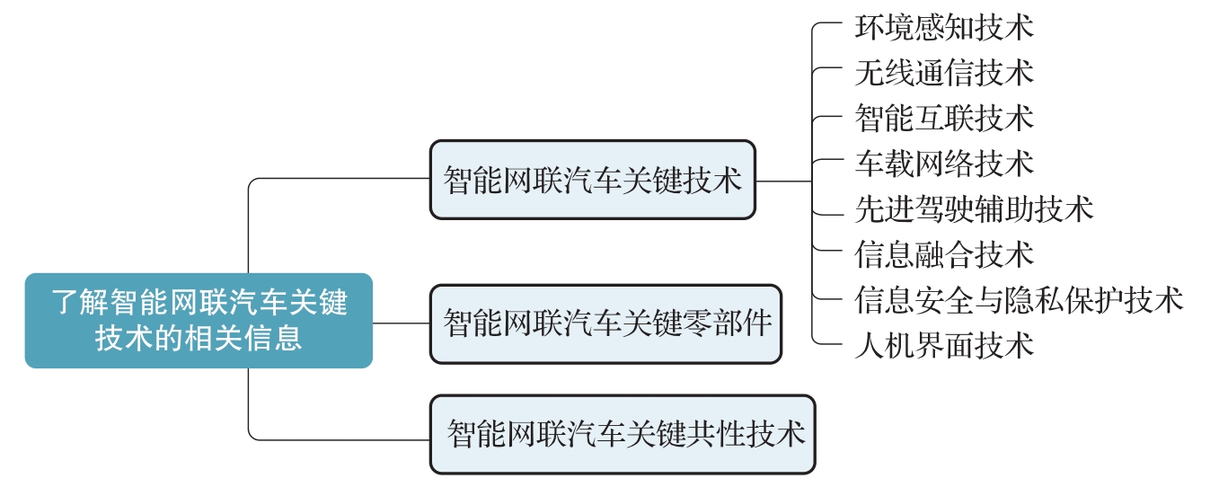 同学们在前面了解过智能网联汽车的概念,智能网联汽车融合了现代通信和网络技术,车辆与外部对象可实现信息共享和协同控制。请查阅资料,了解并简述智能网联汽车都有哪些关键技术。