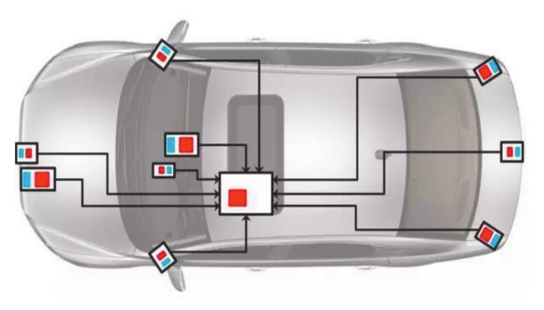图1-3-6所示是采用信息融合技术的传感器全分布式系统,传感器数据由传感器模块处理,决策由中央ECU制定。每个传感器模块中包含一个数据处理器ECU,中央ECU将多个数据组合在一起,并最终决定如何执行或做出反应。