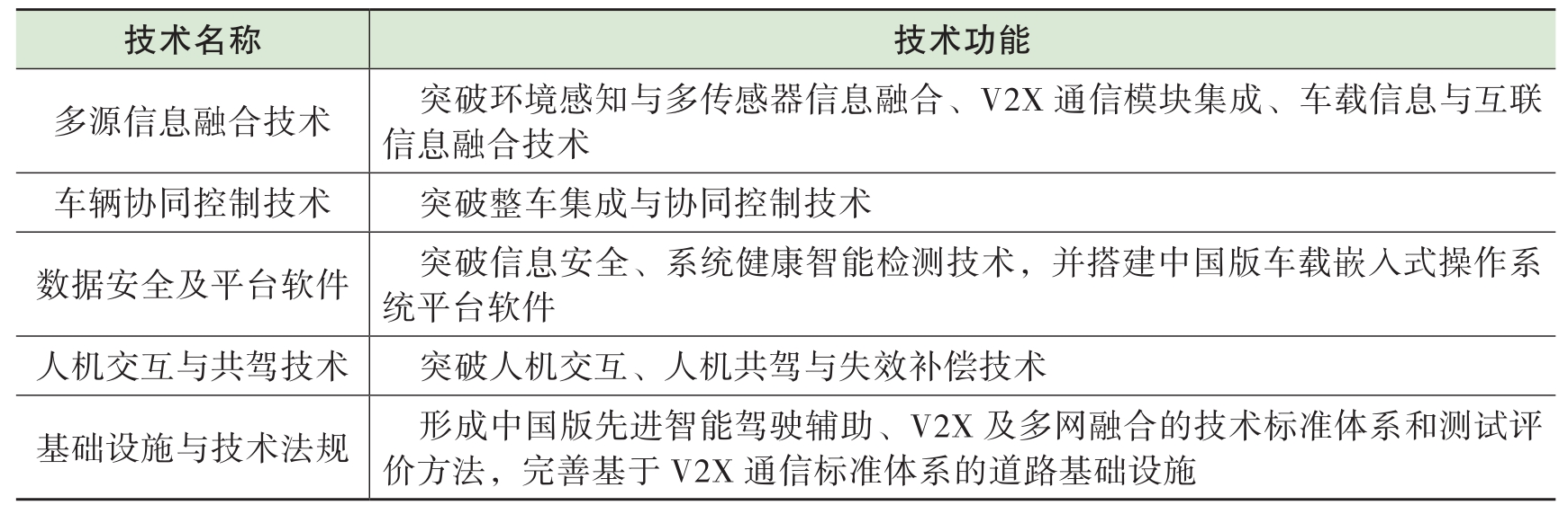 智能网联汽车关键共性技术主要有多源信息融合技术、车辆协同控制技术、数据安全及平台软件、人机交互及共驾技术、基础设施与技术法规等,见表1-3-2。