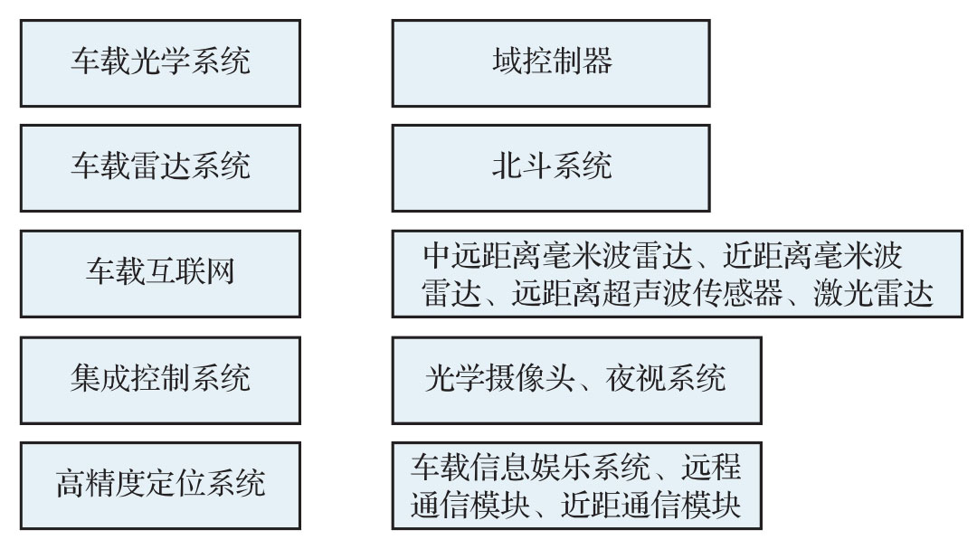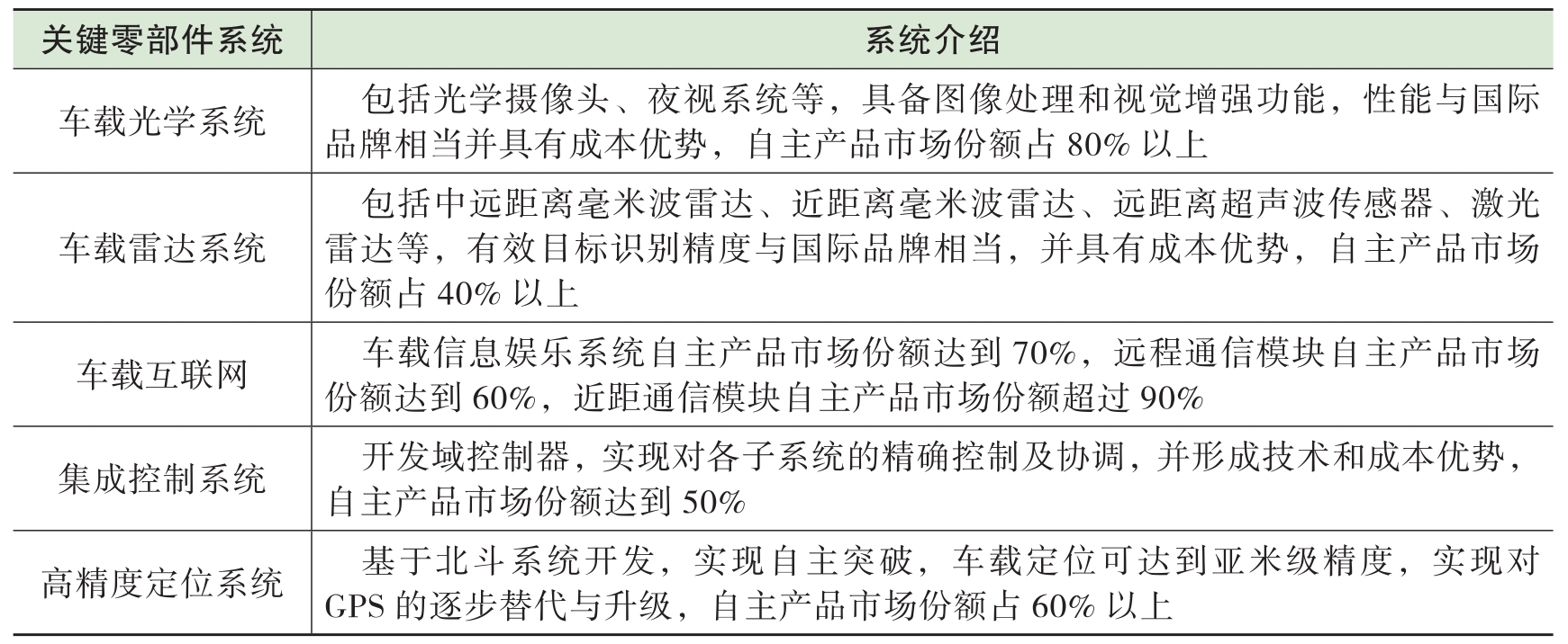 智能网联汽车关键零部件主要有车载光学系统、车载雷达系统、车载互联网、集成控制系统、高精度定位系统等,见表1-3-1。